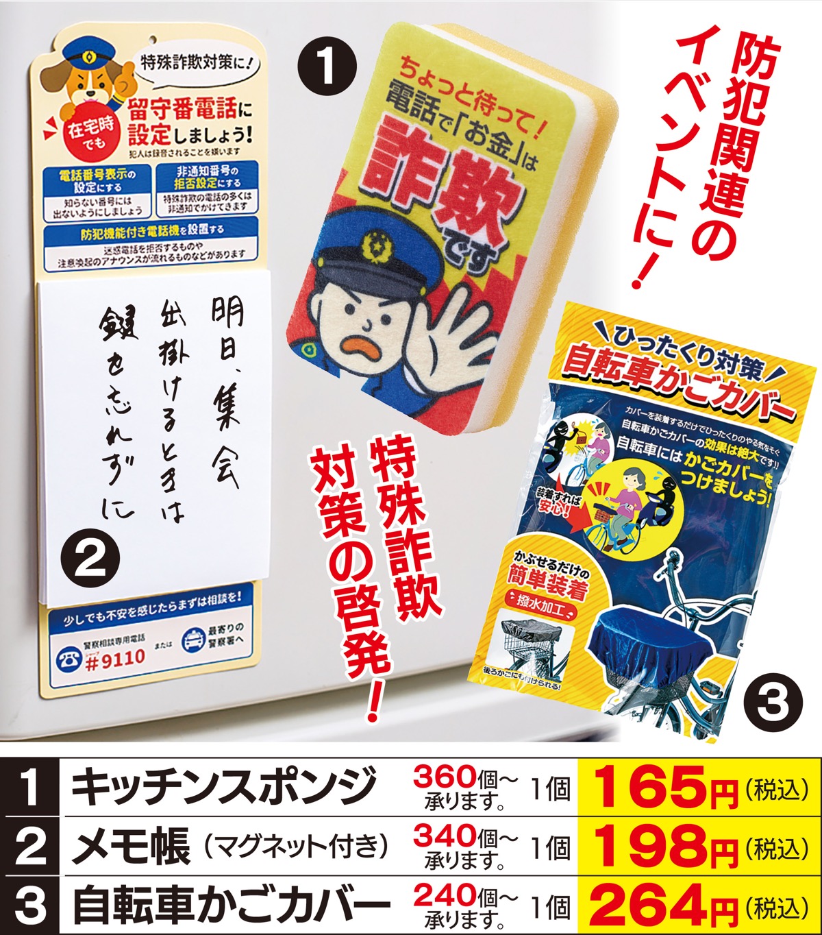 体制強化の基本となるのが、日々の周知活動を通じた防犯意識の向上。そこで紹介するのが、「生活グッズを通じた啓発活動」。防犯イラストを入れたキッチンスポンジや冷蔵庫に貼れるメモ帳、自転車かごカバーを各家庭に配布することで意識向上につながる。