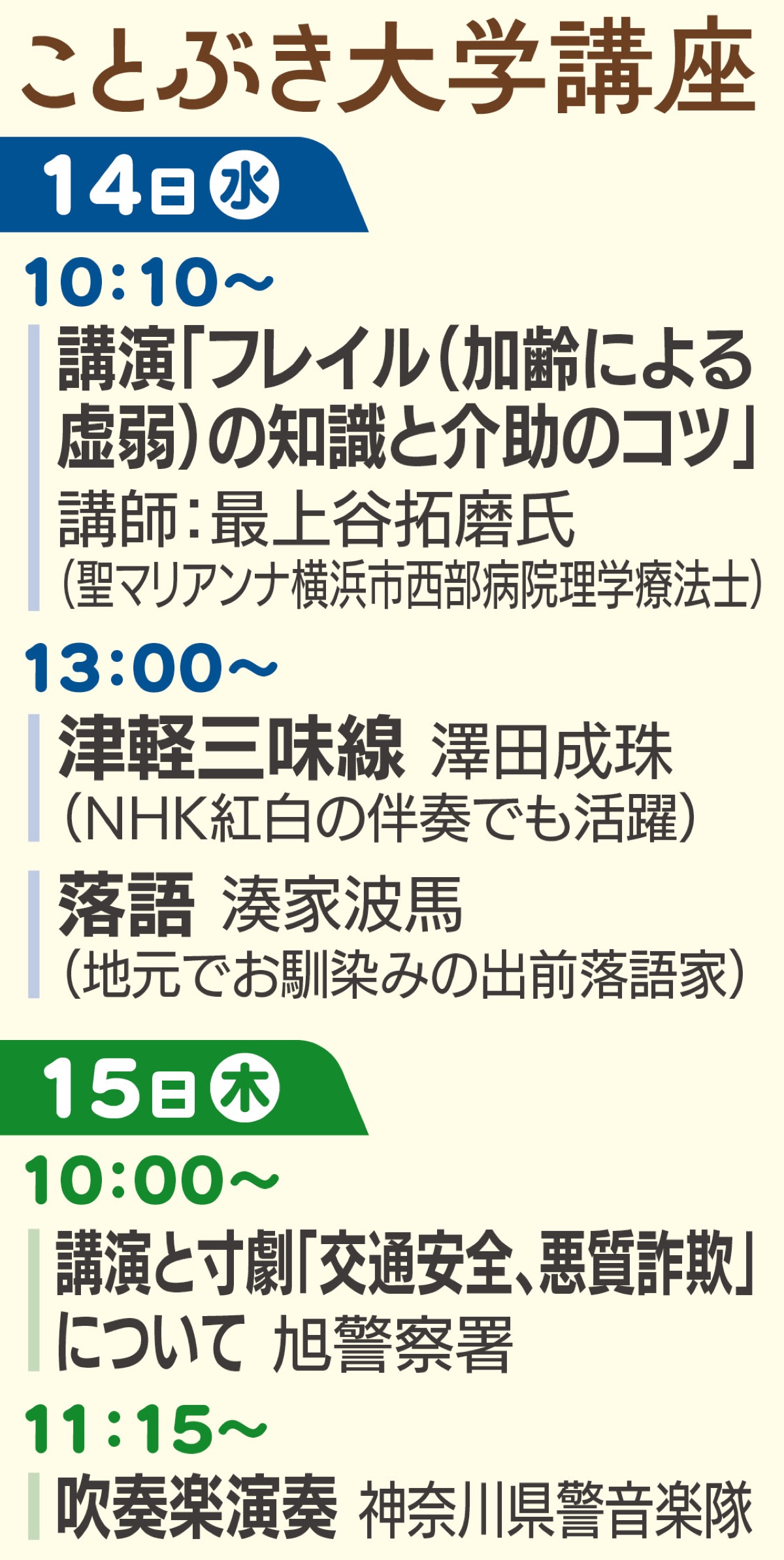 かがやきクラブ旭(旭区老人クラブ連合会)は2月14日(水)と15日(木)、旭公会堂で「ことぶき大学講座」を開催する。