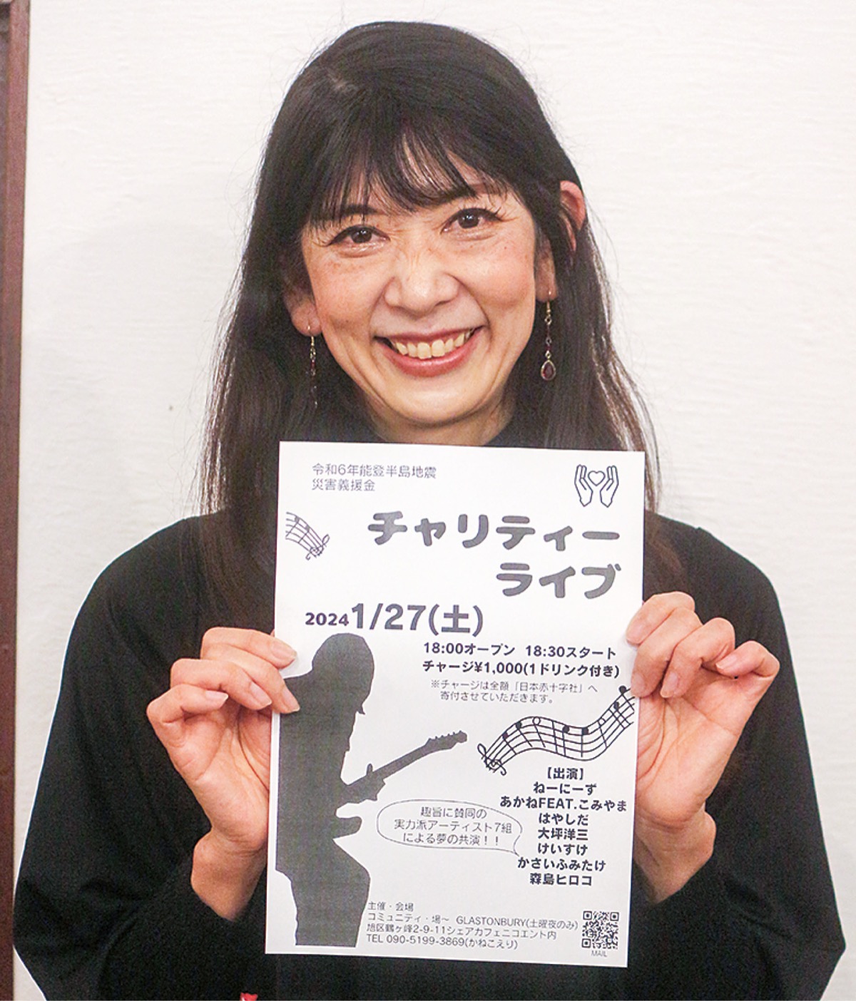 チャリティーライブは、午後6時30分開演。10時30分まで。チャージ料は1ドリンク付で1000円。入退場自由。予約優先だが、席数に限りがあるため、立ち見の場合あり。出演はねーにーず、あかねFEAT.こみやま、はやしだ、大坪洋三、けいすけ、かさいふみたけ、森島ヒロコの7組。また昨年末に同店のオープンマイクに出演した、石川県小松市出身のアーティスト・数馬さんとオンラインで結び、石川県の現状報告や数馬さんのライブなども予定している。金子さんは「震災体験者の話を聞くことで、自分事とし、支援や防災につなげられれば」と語った。