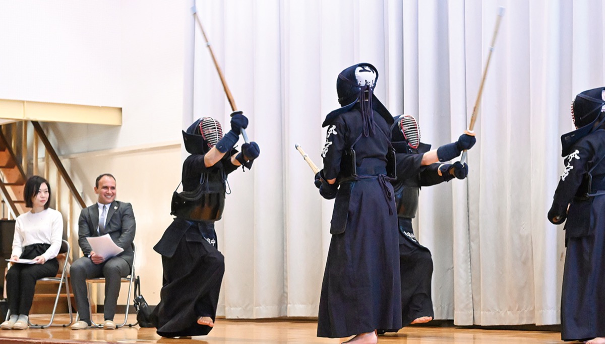 講演会で、アドゥニさんはチュニジアの地理や料理を紹介。チュニジアの子どもたちからは、日本のアニメの曲を演奏したビデオメッセージも送られた。本宿中からは、柔道部、剣道部の生徒が演武を披露。両国の文化を発信しあった。