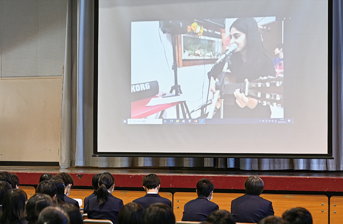 同中学校では、海外の子どもたちと環境問題や貧困について意見を交わし合う「アートマイル国際協働学習プロジェクト」に取り組んでいる。今年度はチュニジアの子どもたちと交流していることから、アドゥニさんの来校が実現した。