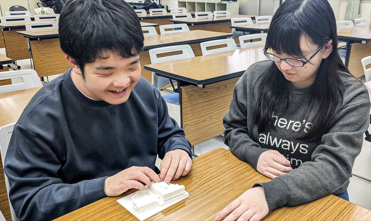 イベントでは、鶴見大学の元木章博教授と教授の研究室に所属する学生らが、3Dプリンターで作成した建物や植物などの立体模型を視覚障害者らが触れる体験をした。