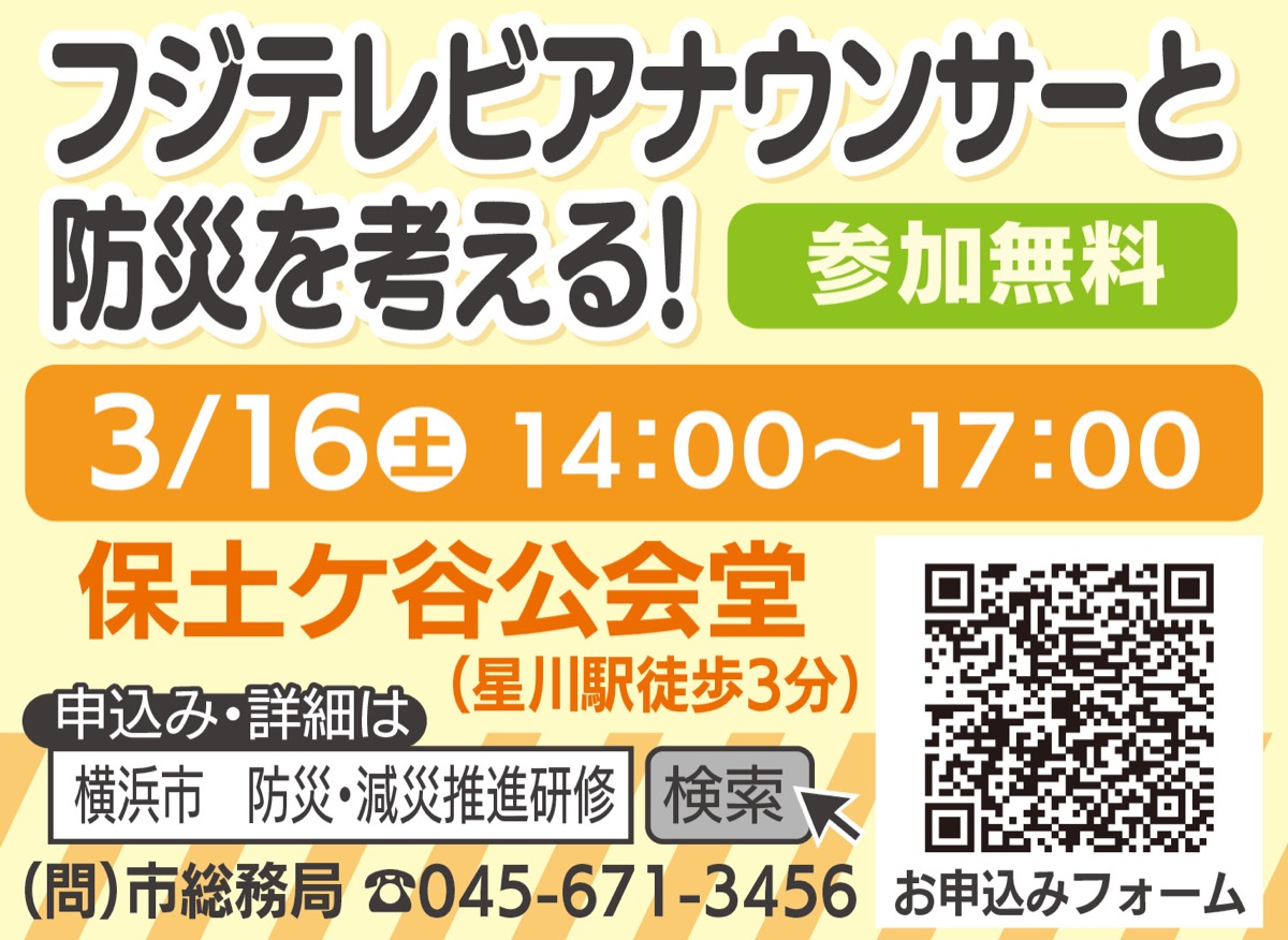 横浜で大地震が発生した際、被害を軽減するには―。3月16日(土)、保土ケ谷公会堂(星川駅徒歩3分)で「フジテレビアナウンサーと防災を考える!」が行われる。