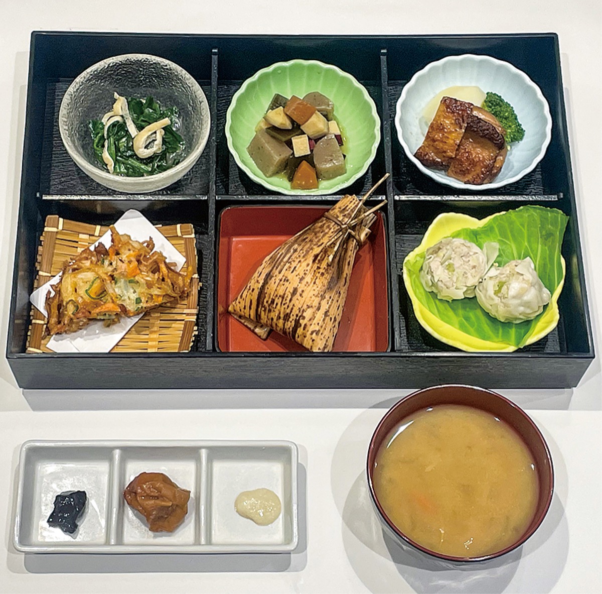 食堂の助言も受けながら、春野菜のおひたしや野菜のかき揚げなど野菜を多く使う料理を採用。提供する野菜は、区内の農家である「藤又農産」から仕入れた。食堂側が「武士っぽい料理」を考案し、ちまき風の強米を取り入れるなど、工夫を凝らした。
