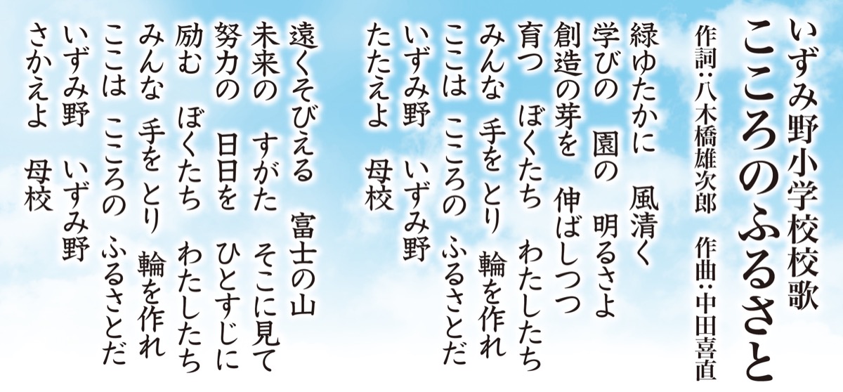 記念式典では地元のアシノ・マンダリン・アンサンブルが同校の校歌を手掛けた中田喜直氏にちなみ「めだかの学校」などを披露。続いてプロのオペラ歌手4人からなる「いずみ野小ファイナルスーパーカルテット」が中田喜直氏が作曲した「小さい秋見つけた」「夏の思い出」などを熱唱した。最終盤には会場の児童らと「いずみ野小学校校歌」を歌い上げ、幕を閉じた。