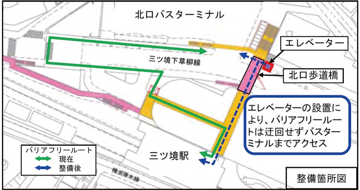 市では2007年、三ツ境駅周辺地区交通バリアフリー基本構想を策定。瀬谷区役所方面に向かう線路沿いにエレベーターを設置するなど対策を進めた。その一方、バスターミナルに向かう経路のバリアフリー化は構造的な問題から断念せざるを得ず、長年の課題として残っていた。地域住民やバス利用者からも改善を望む声が挙がっていたという。