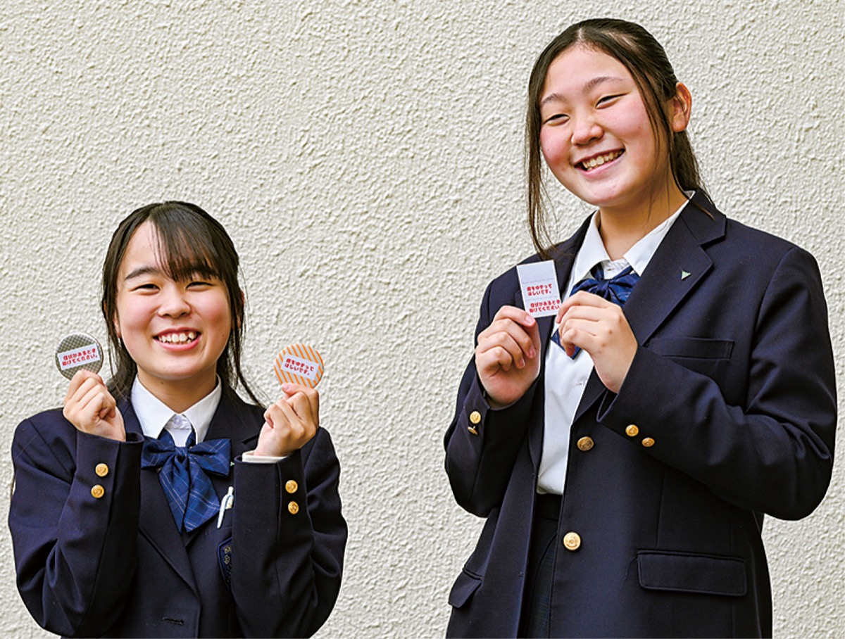 星槎高等学校(旭区若葉台)3年生の山影菜花(なな)さんと吉田真泉(まなみ)さんがこのほど、ヘルプマークに意思表示の文言を添えるための、缶バッジに貼り付けるテンプレートシールを作成。「相互理解を広めるために、シールを普及したい」という思いから、NPO法人の設立を計画している。