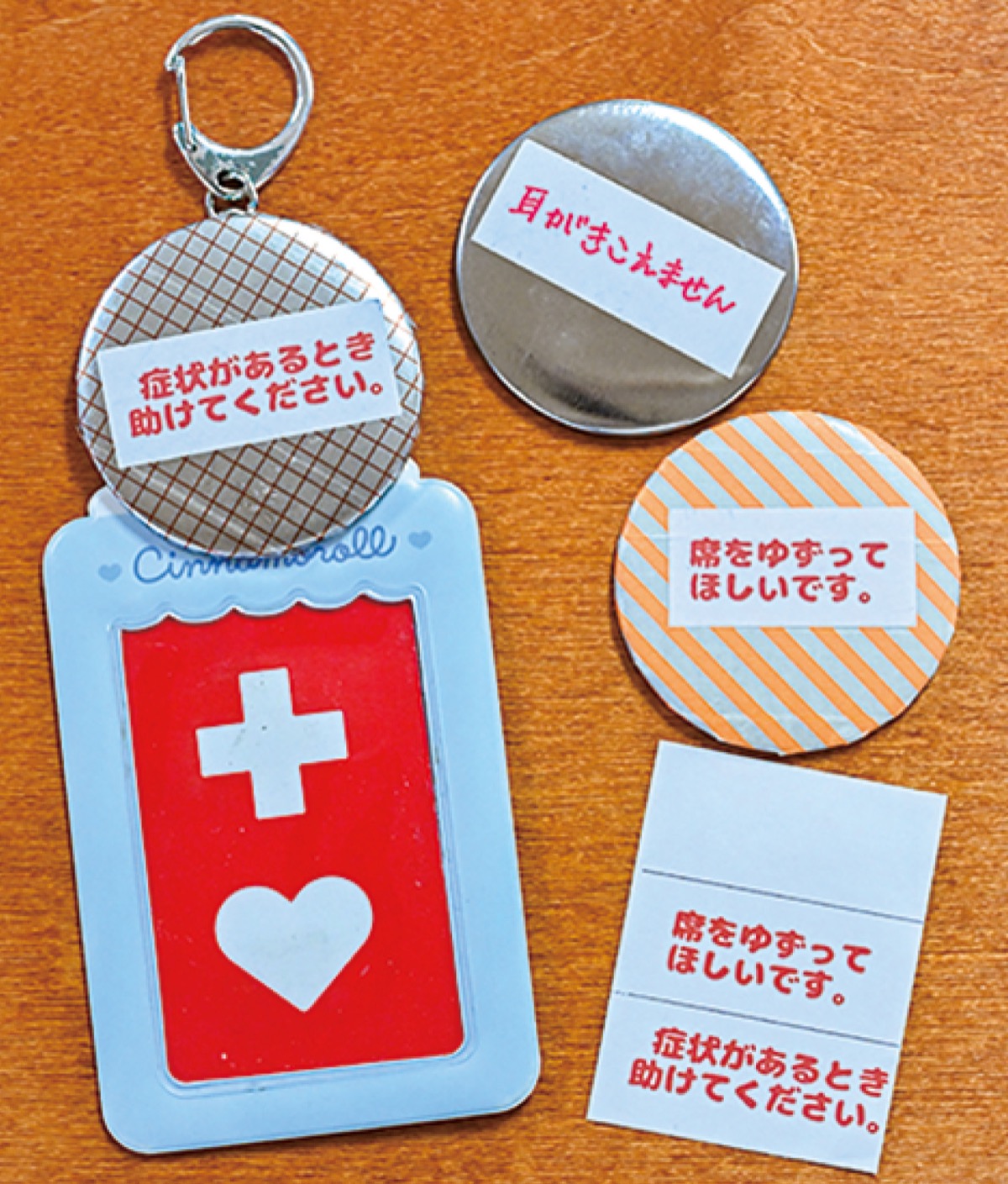 2人が作成したシールには「席を譲ってほしいです」「症状があるとき助けてください」など、ヘルプマークだけではわからない症状を記載。マークには缶バッジが取り付けられるようになっているため、シールを使用することで適切な援助を受けられるように工夫されている。