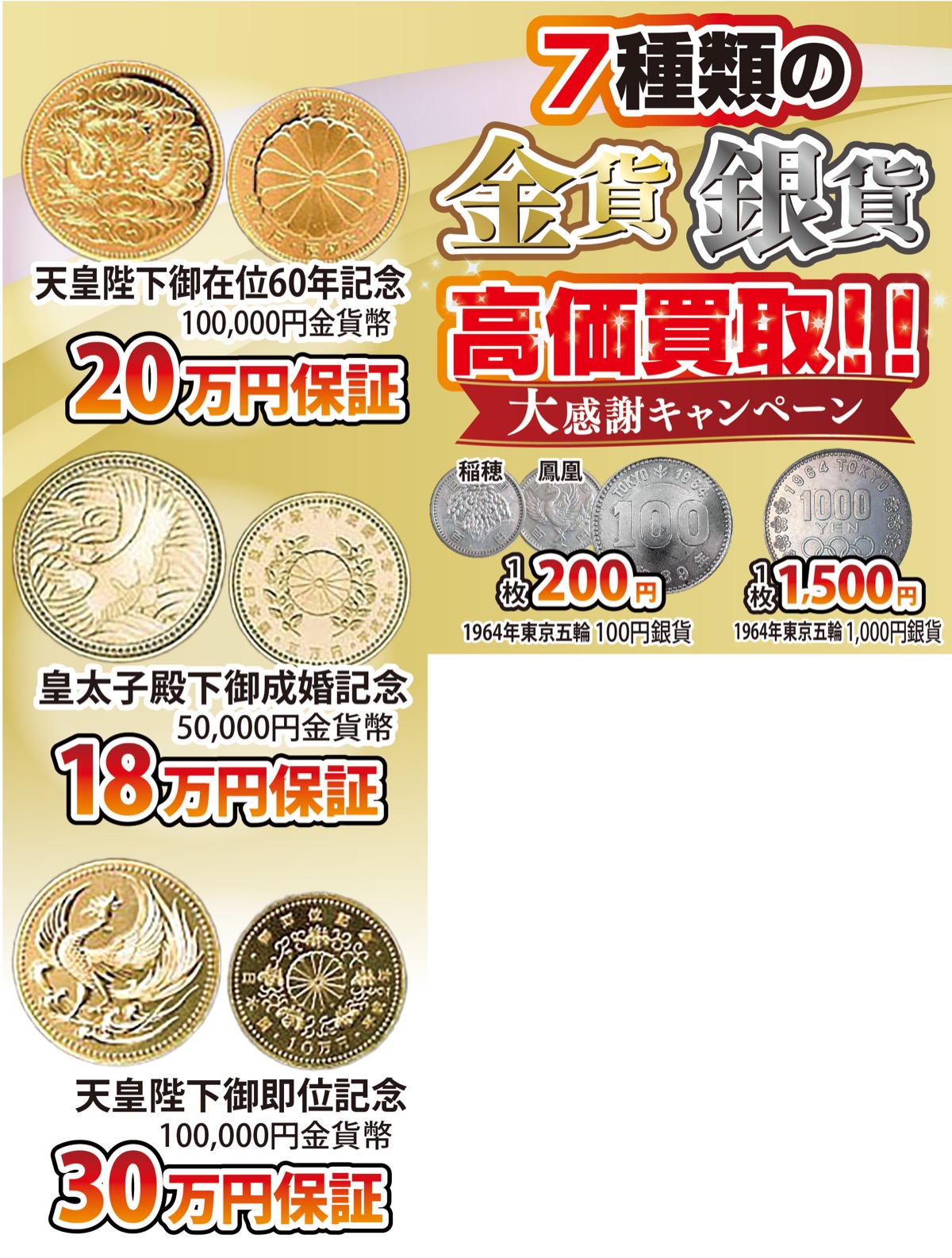 対象は「皇太子殿下御成婚記念5万円金貨幣」「天皇陛下御在位60年記念10万円金貨幣」「天皇陛下御即位記念10万円金貨幣」「1964年・東京五輪記念100円銀貨幣(鳳凰・稲穂・五輪)」「1964年・東京五輪1000円銀貨幣」。