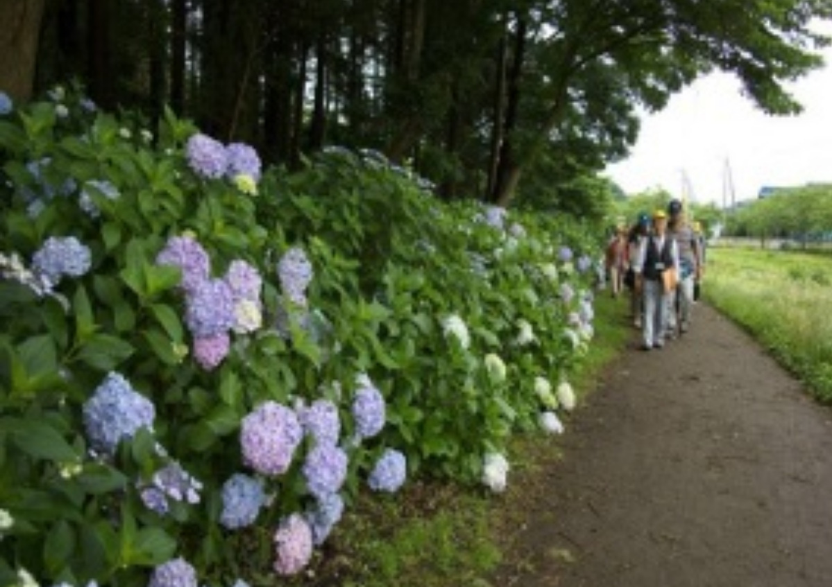 瀬谷区の花のアジサイは区内各所にスポットがあり、和泉川もその一つ。当日は相鉄線三ツ境駅前広場で午前9時から15分間参加を受付。「アジサイロード」として人気の東山ふれあい樹林、6本の道が交わる「六道の辻」、水面に映った影と合わせて眼鏡の様に見える「めがね橋」などを巡り、午後0時30分頃に宮沢バス停で解散予定。