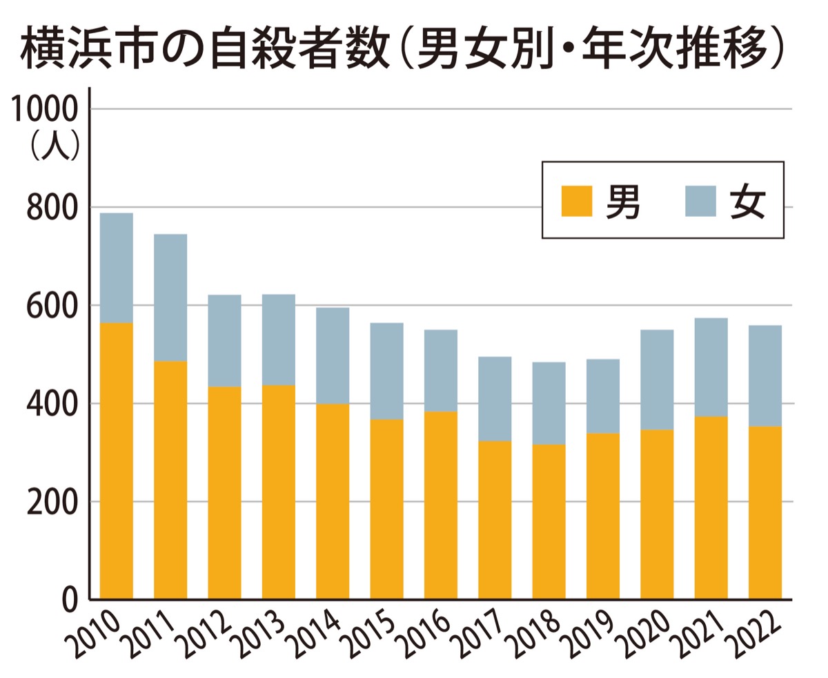 市の自殺者数は、リーマンショック後の09年をピークに減少傾向にあった。しかし、新型コロナウイルスの流行で身体や心の健康、経済面での悩みなどを理由に20年以降再び増加傾向となり、特に女性が増加している。