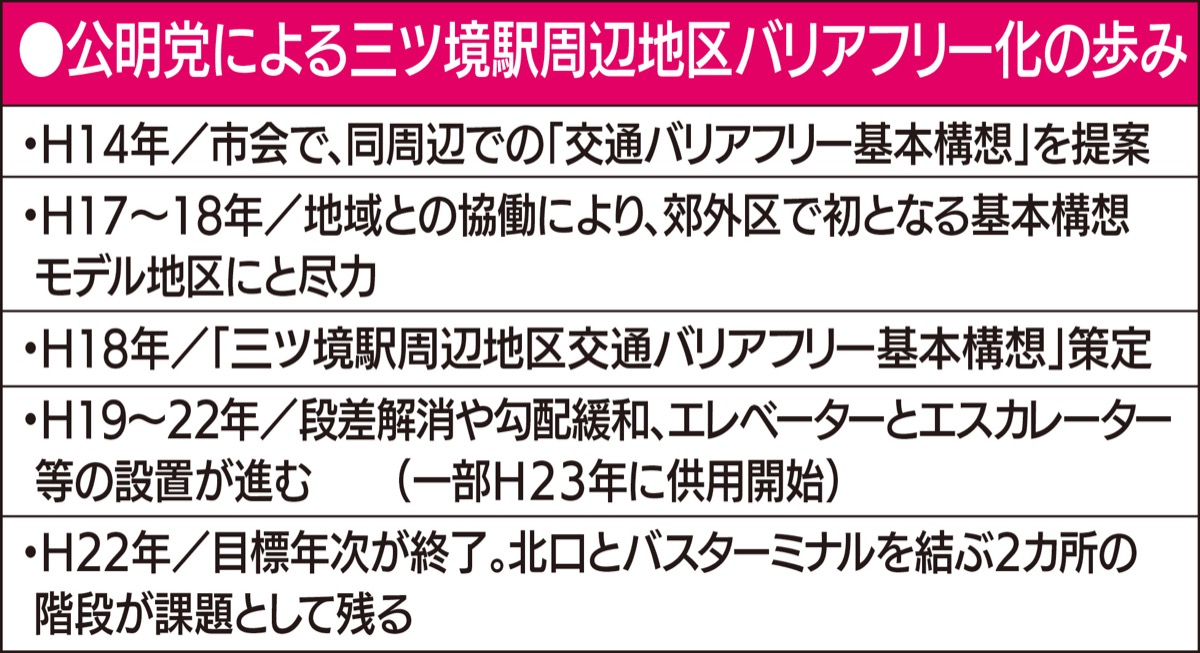 公明党による三ツ境駅周辺のバリアフリー化の取組は平成14年に始まり、同22年に目標年次が終了。北口とバスターミナルを結ぶ最短ルートの階段2カ所が課題として残っていました。私は地域の方々と共に陳情書を林前市長に提出(R2年)。予算編成で要望を重ね、R4・6年度の予算審議等でも改善を求める質疑を行い、早期実現に向けた答弁を得てきました。その結果、調査・設計が実施され、今年度に工事着手の予定です。