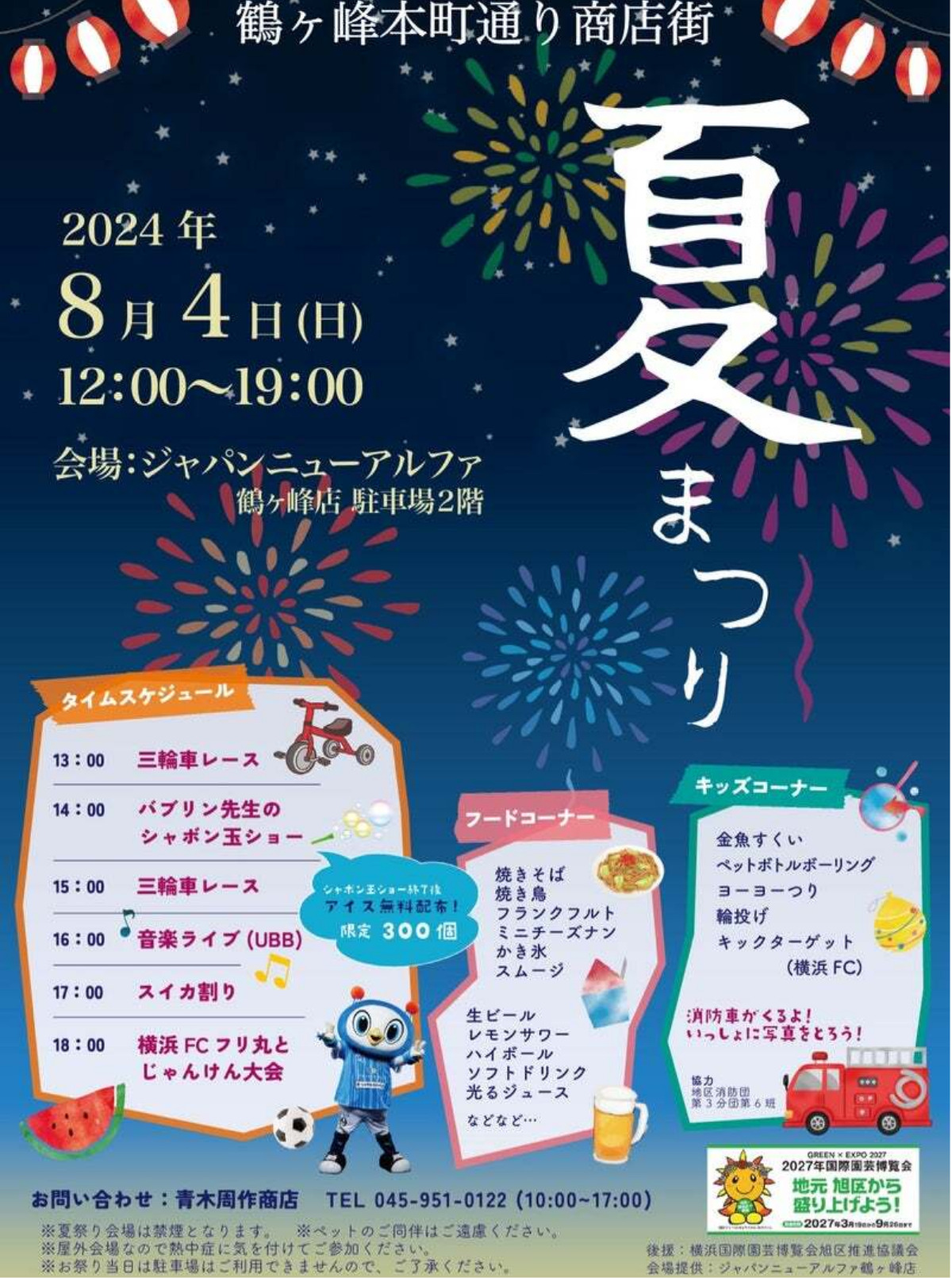 鶴ケ峰本町通り商店街(三村勝己会長)主催の「夏まつり」が8月4日(日)、ジャパンニューアルファ鶴ヶ峰店=旭区鶴ヶ峰本町1の38の3=の駐車場2階で行われる。正午から午後7時。雨天決行。
