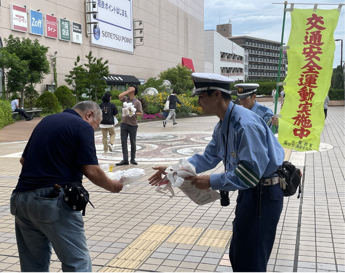 当日は、瀬谷区役所や交通安全協会など各団体が参加。駅利用者や通行人に反射材や安全な自転車利用を呼びかけるビラなどを配布した。