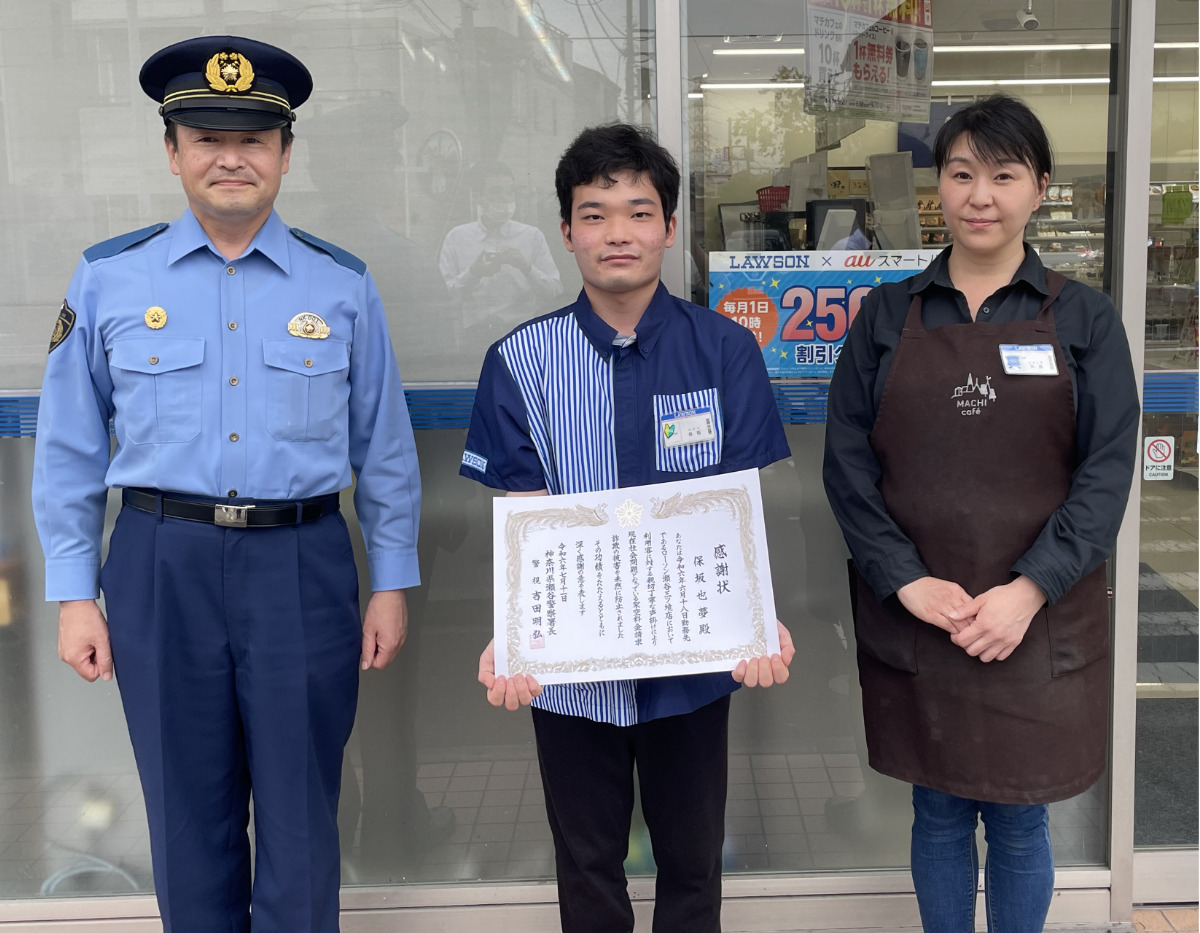 同日、特殊詐欺を未然に防いだとして、ローソン瀬谷三ツ境店に勤務する保坂也夢(なりむ)さんに吉田署長が感謝状を贈呈した。