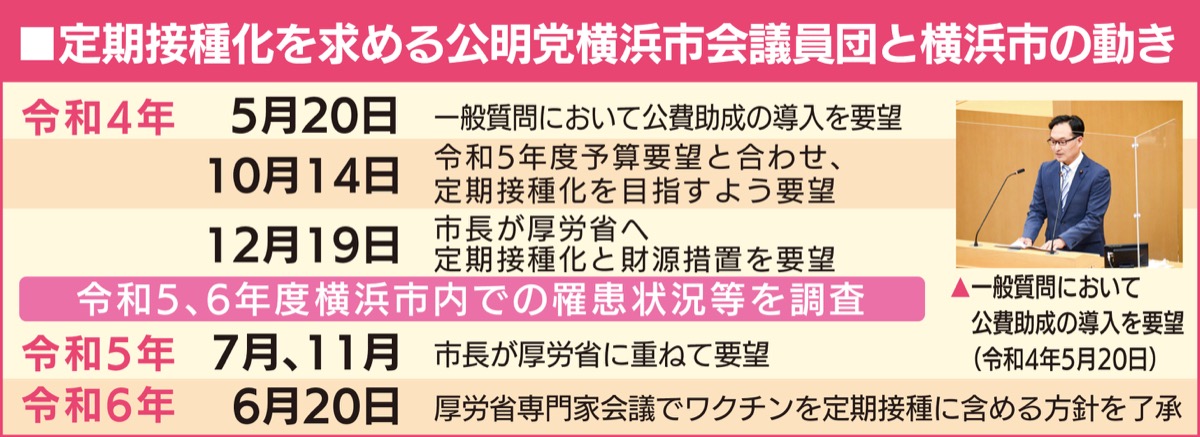 一方、公明党横浜市会議員団も、こうした動きと連携して繰り返し「接種費用の助成」と「国への定期接種化の働きかけ」を市に求めてきました(下記年表参照)。