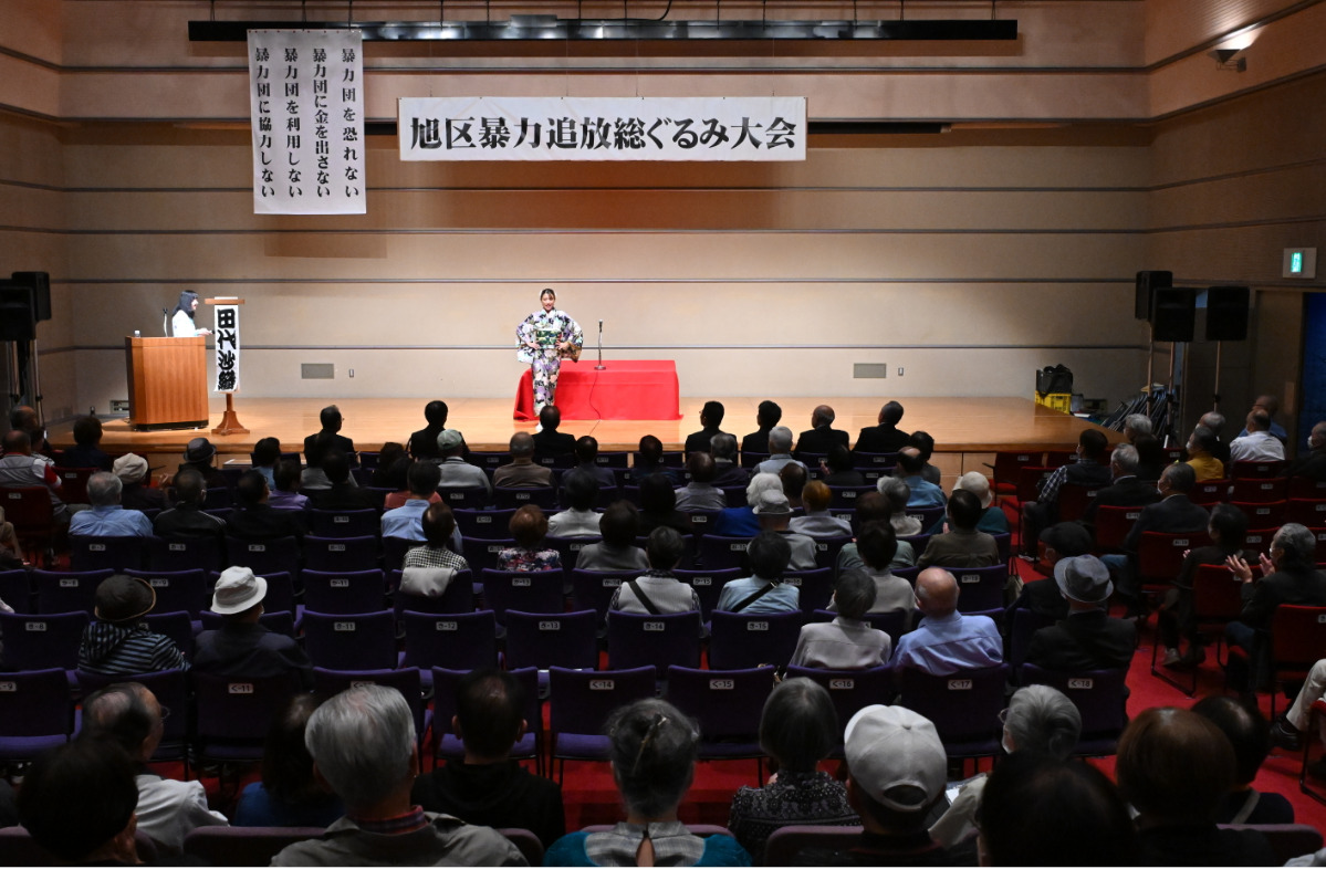 旭区暴力団排除対策推進協議会が主催し、同会の松本榮次会長や旭警察署の吉田善成署長らが参加した同大会。松本会長は「詐欺が多発していて、暴力団の資金源になっている。警察、区役所、区民が一致団結して排除に努めてほしい」と呼びかけた。
