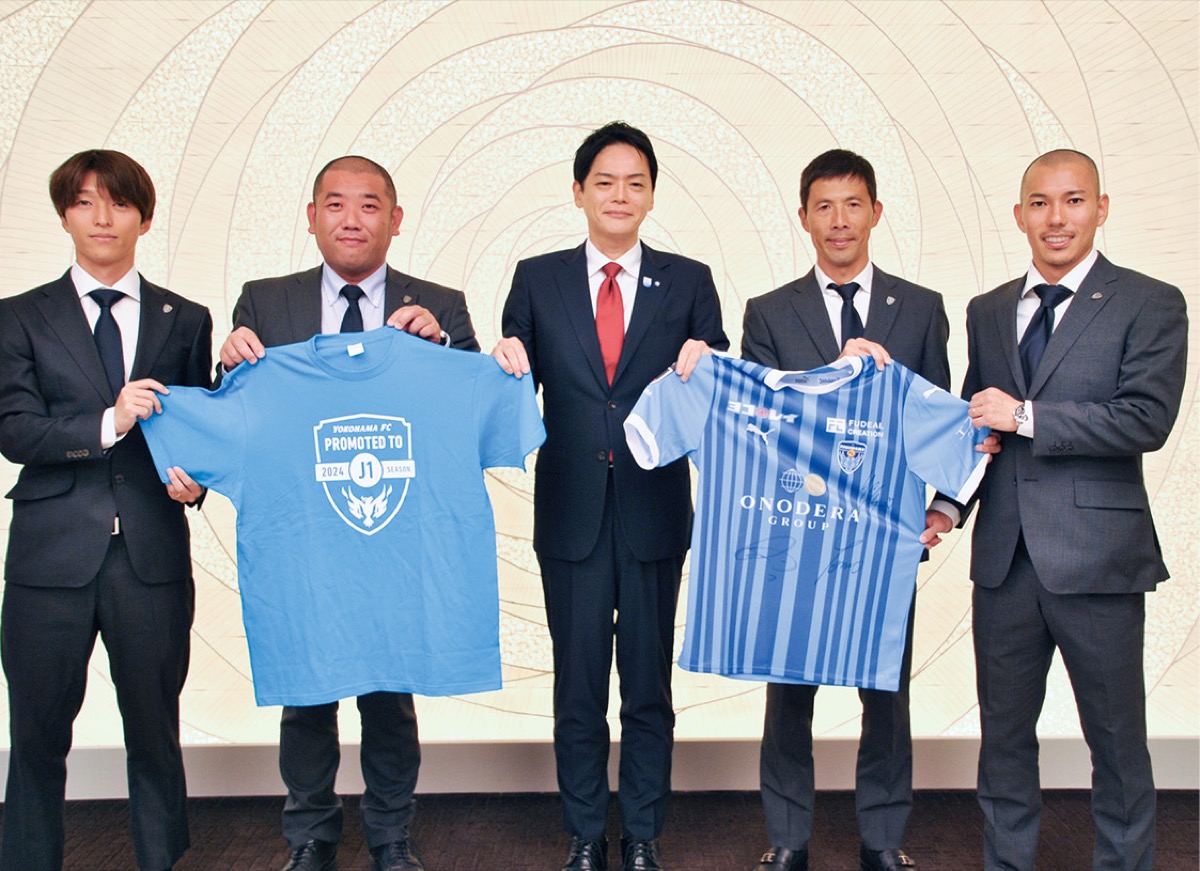 サッカーの明治安田J2リーグを2位で終えた横浜FCの関係者が11月13日、横浜市役所を訪問し、山中竹春市長にJ1昇格を報告した。