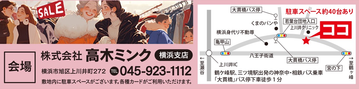 若葉台団地入口交差点すぐそばの(株)高木ミンク横浜支店で12月7日(土)、年に一度の大感謝祭「FAMILY SALE 2024」が開かれる。午前9時から午後5時。