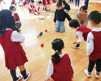同会では、児童が園児にボッチャをレクチャー。後半では園児たちがゲームを行い、盛り上がりを見せた。