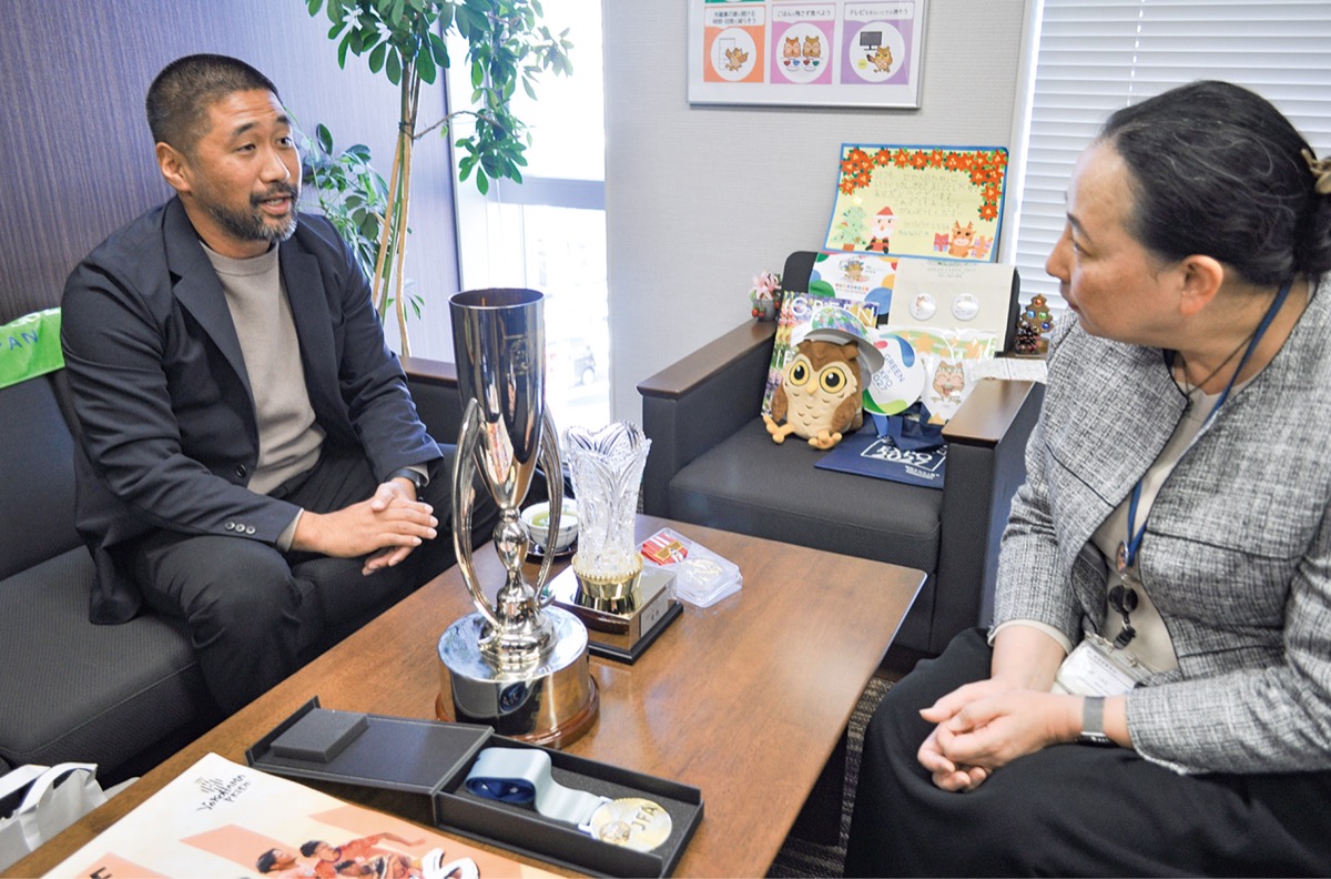 表敬訪問で奥山さんは大会のトロフィーやメダルを持参し、チーム初となる2冠を報告。地域との関わりについても触れ、「(中屋敷の)コートがビーチサッカーを観るだけではなく、地域住民が運動できる拠点になれば。子どもたちの憧れとなれるよう頑張りたい」と話した。植木区長も、「地域のなかで、(レーヴェ横浜が)『うちのチーム』」と言われるような関係づくりをしていければ」と連携に意欲を見せていた。