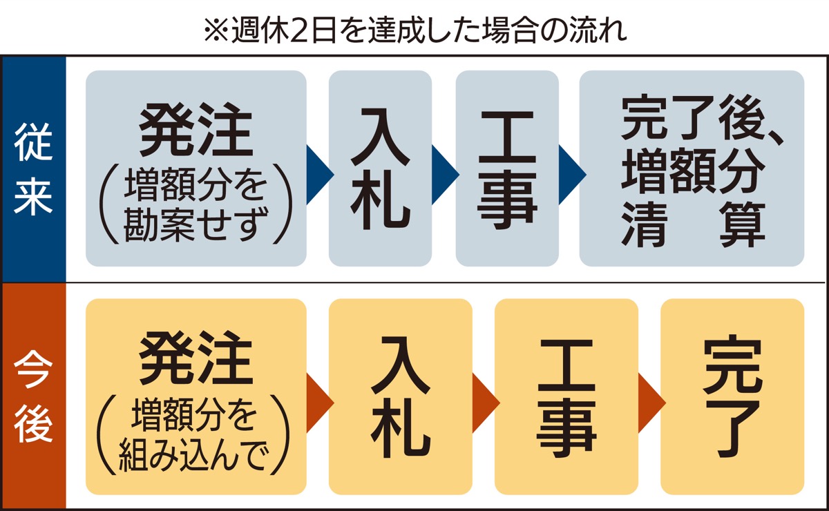 さらに来年度早期をめどに、発注方法自体も見直す方針だ。週休2日を確保することで工期が延びると、機械の賃料や現場管理費、労務費が以前より必要になる。従来はこういった増額分について市は、予算に計上しつつも発注段階では組み込まず、工事完了後に実態を確認した上で清算する流れだった。今後はこの増額分を発注時点であらかじめ組みこむという。