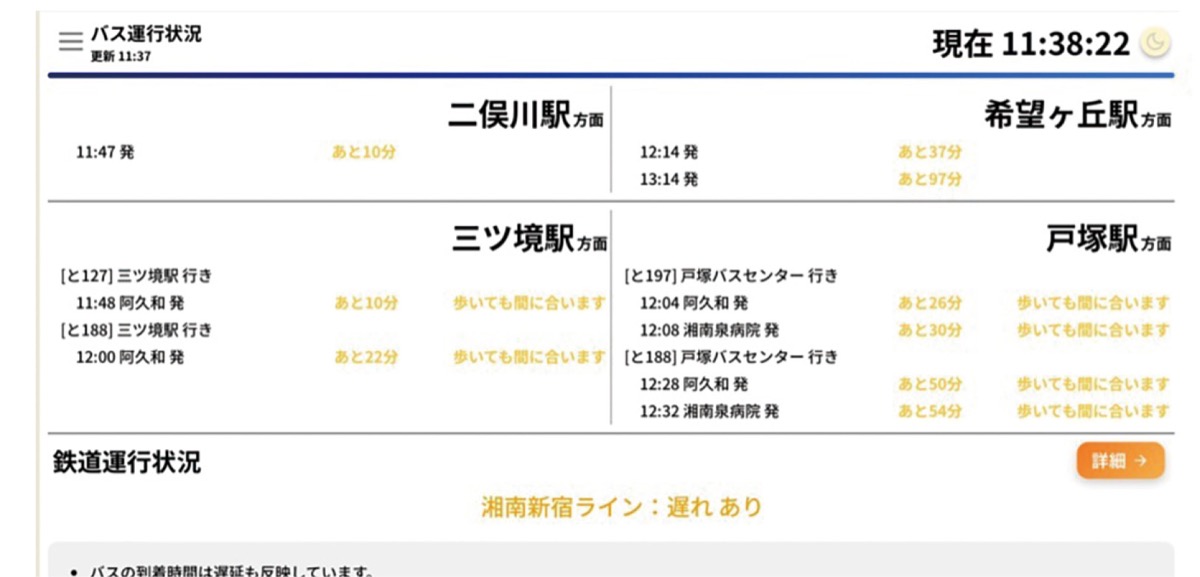 サイトには二俣川駅、希望ヶ丘駅、三ツ境駅、戸塚駅に向かう各バスの発車時刻や遅延状況が記載されている。また、到着までの時間に合わせ、「歩いても間に合います」、「走ったら間に合います」など校舎からバス停に向かった際の目安も表示。さらに、6社10路線の鉄道運行状況も閲覧でき、同校関係者にとって大きな助けとなっているという。