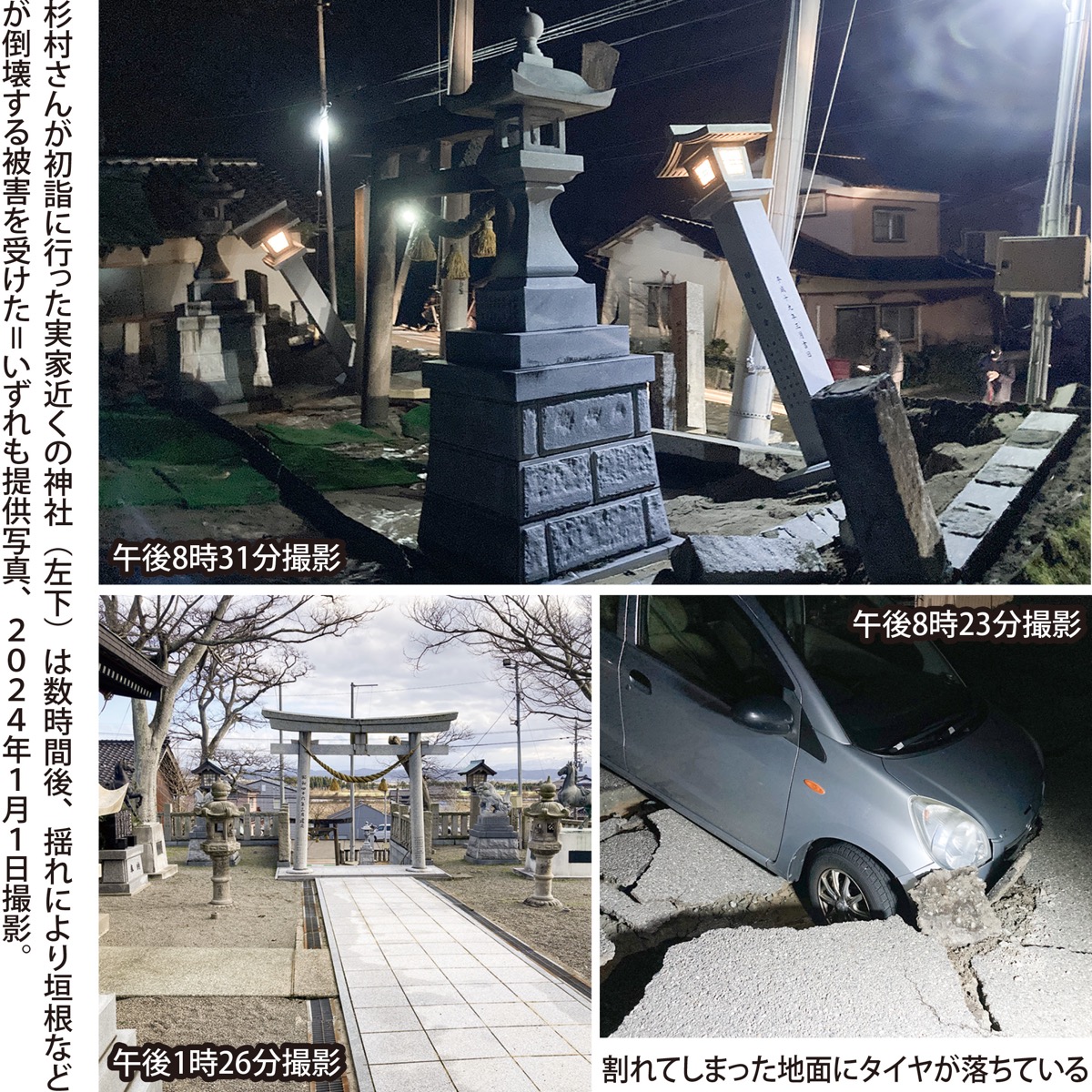余震が落ち着いた午後8時頃、父と町の様子を見るため外へ。地割れや液状化が見られ、左右で明らかに高さが違う場所もあった。初詣に訪れた神社は、垣根が倒壊し「ショックでした。数時間前に来た場所がこんなことに……」と精神的なダメージも大きかった。