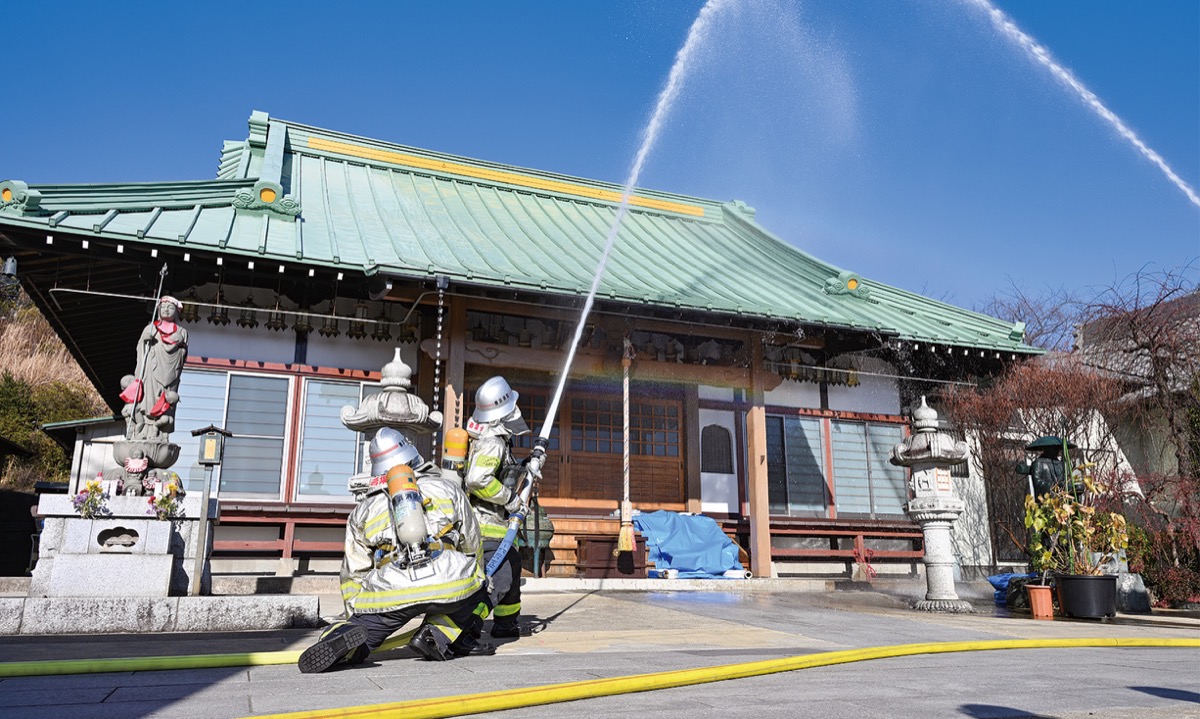 訓練には若葉台消防出張所や地元消防団の人たちが参加した。本堂が火災に遭った想定で、消防職員が逃げ遅れた人や木造大日如来坐像に見立てた人形を救出。その後消火のため本堂へ放水した。