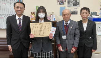 保土ケ谷間税会(遠藤昇会長)が主催する「第13回税の標語」において、瀬谷中学校3年の平野結彩(ゆあ)さんの作品が保土ケ谷税務署長賞に選ばれた。