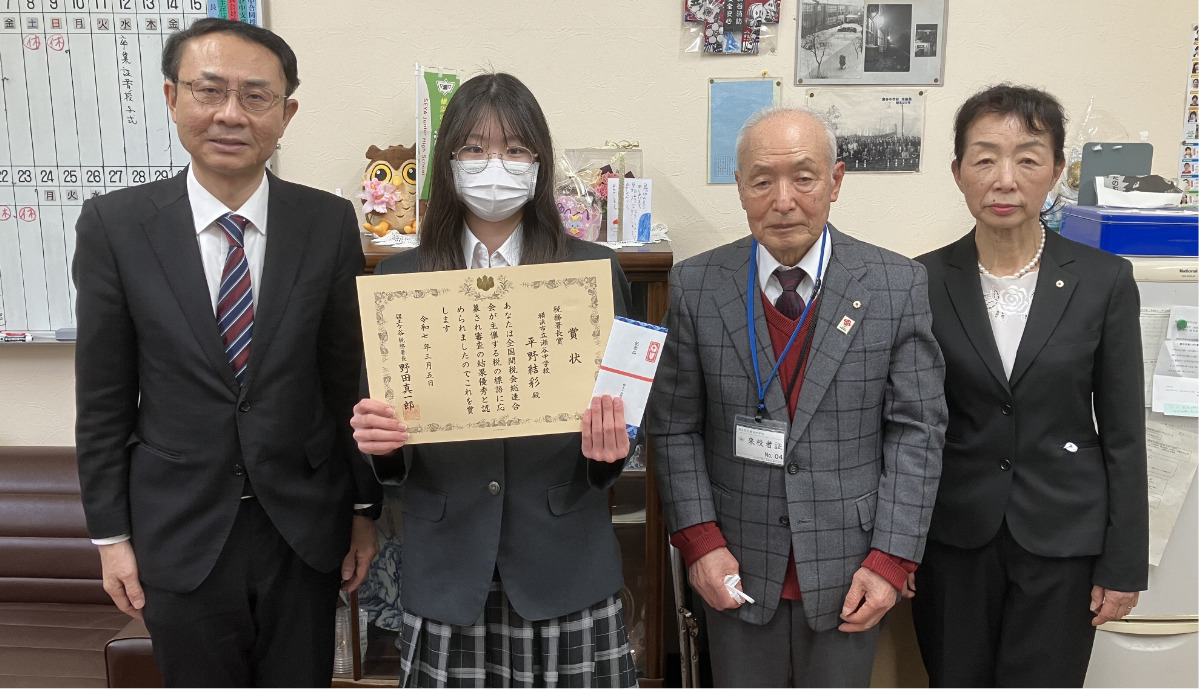 平野さんの作品は、『支え合う 税が作るよ 安心の輪』。3月上旬に、野田真一郎保土ケ谷税務署長と遠藤会長が瀬谷中学校を訪れ、平野さんに表彰状を手渡した。