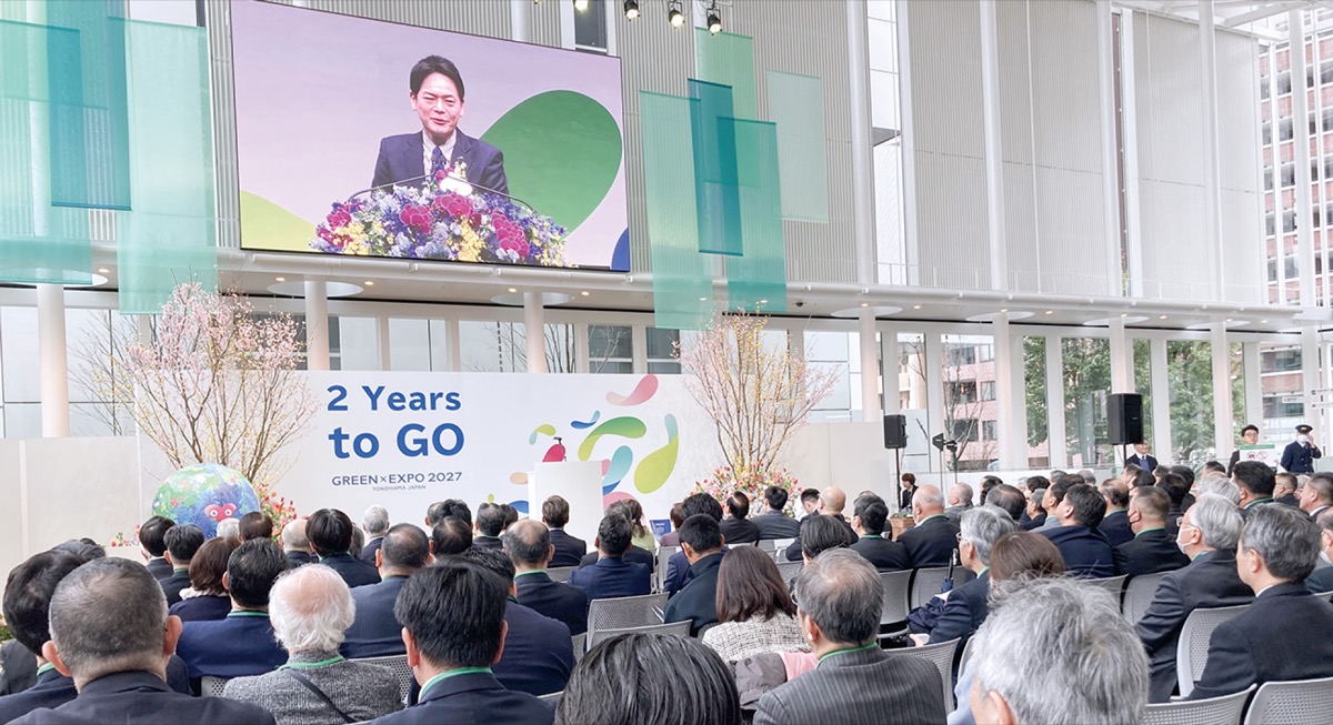 この日は(公社)2027年国際園芸博覧会協会による記者発表会が日本橋三井ホールで開催され、十倉雅和会長、副会長を務める山中竹春横浜市長と黒岩祐治神奈川県知事が2年後に向けた意気込みなどを語った。東京会場との同時配信も行われた横浜市庁舎でのセレモニーには市会議員や市内企業・団体の関係者など150人超が来場。平原敏英副市長や、2027年国際園芸博覧会を成功させる横浜市会議員の会会長の鈴木太郎市会議長などがあいさつした。