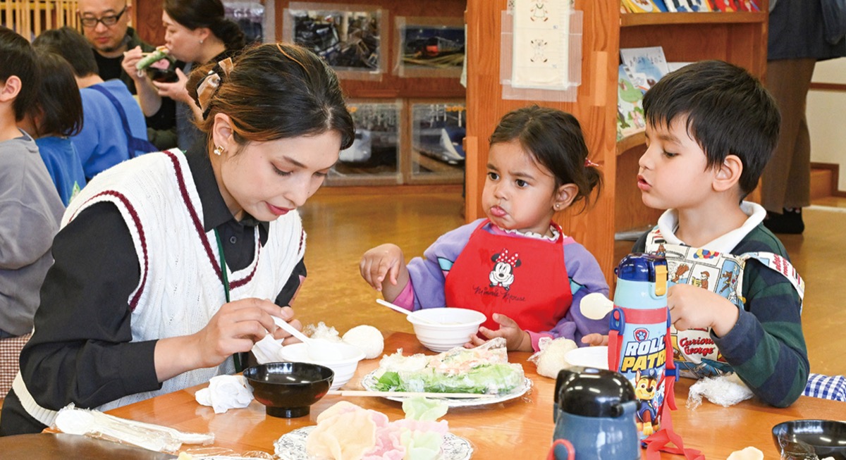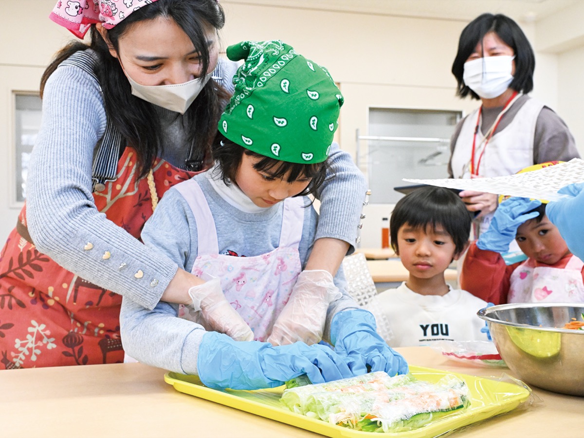 当日は、にこてらすで働く中国人やベトナム人の指導で、ワンタンや生春巻きをクッキング。日本を含めて9カ国の家族が参加し、協力して料理を作り上げた。ベトナム人スタッフは「ゆっくり巻くと破れてしまう」などと、生春巻きの上手な作り方を伝授していた。