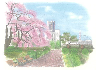 年賀はがきに採用されたイラストは、横浜万騎が原郵便局勤務の北瑛理奈さんが描いた「山下公園のしだれ桜とみなとみらい」。ランドマークタワーなどの建物をバックに、満開のしだれ桜が描かれている。