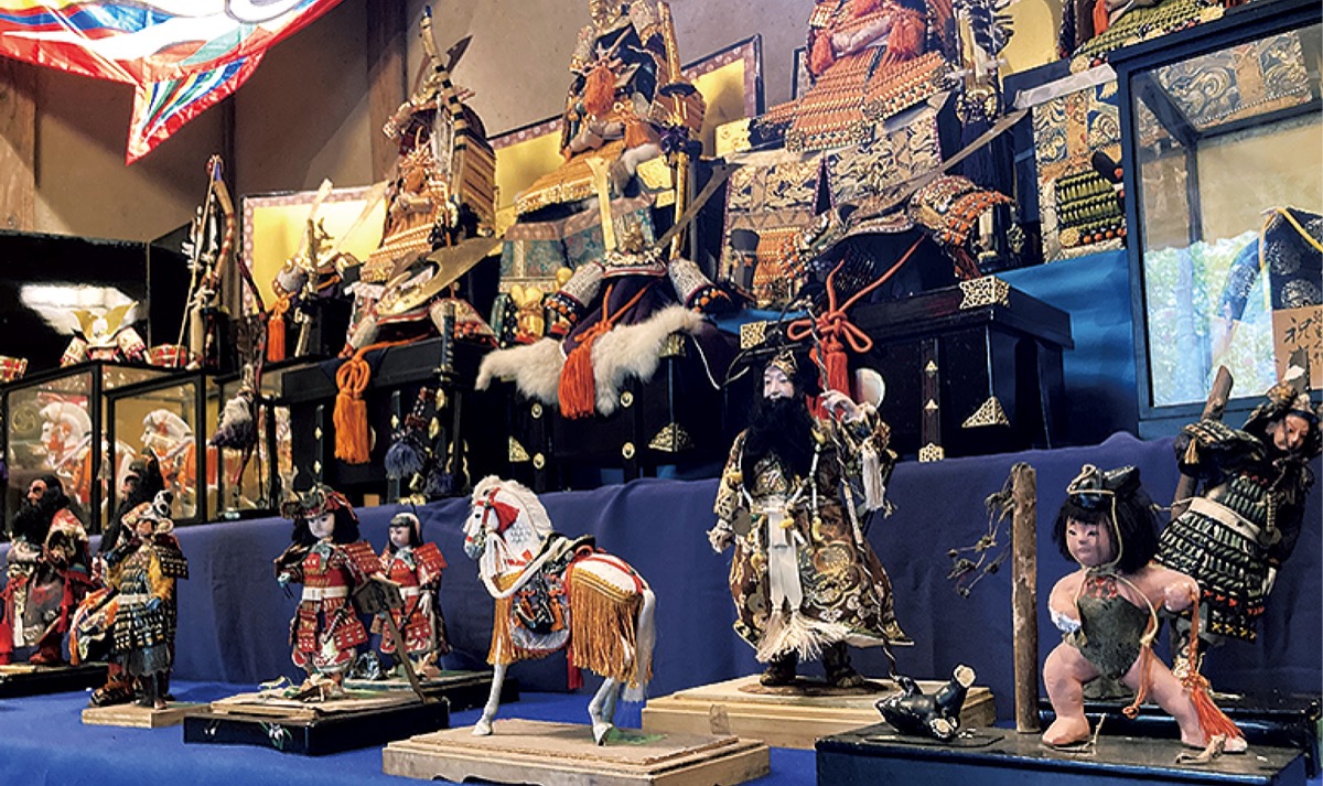 5月17日(土)までは園内の母屋前や奥庭に約70匹の鯉のぼりが掲揚されているほか、五月人形や兜も展示されている。