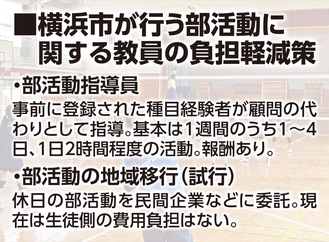 教員の働き方改革を進める横浜市は、中学校の部活動顧問の負担軽減策として、教員以外が指導できる制度の活用を進めている。生徒らから外部人材の指導を歓迎する声がある一方、教員以外が学校施設を使用することなどの課題もある。市は課題を整理し、「持続可能な部活動を目指したい」としている。