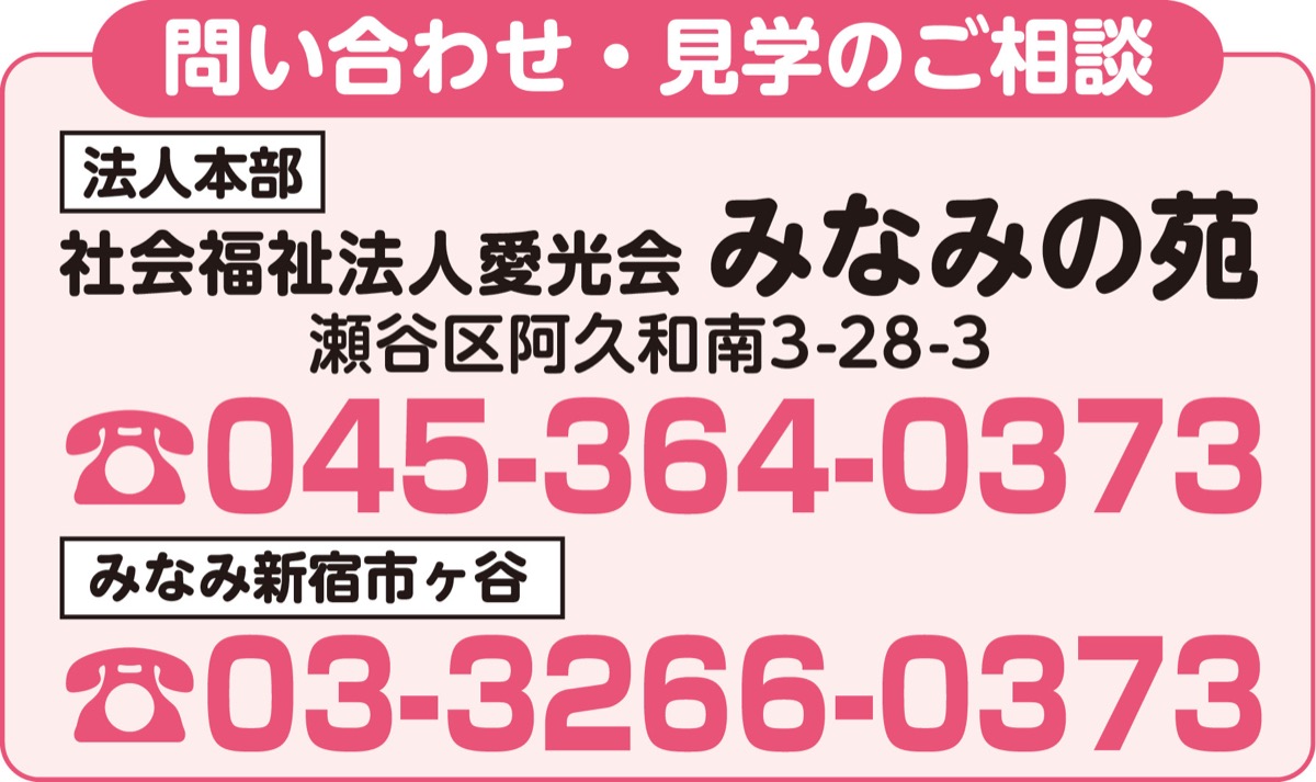 「安全・安心・信頼」の理念を掲げ、瀬谷区阿久和南の「みなみの苑」など横浜市内でグループホームやデイサービス、訪問介護などを手がける「社会福祉法人愛光会」。6月1日(日)、東京都新宿区に小規模多機能型居宅介護事業所や認知症対応型グループホーム、障がい者グループホームが入る「みなみ新宿市ヶ谷」を開設する。
