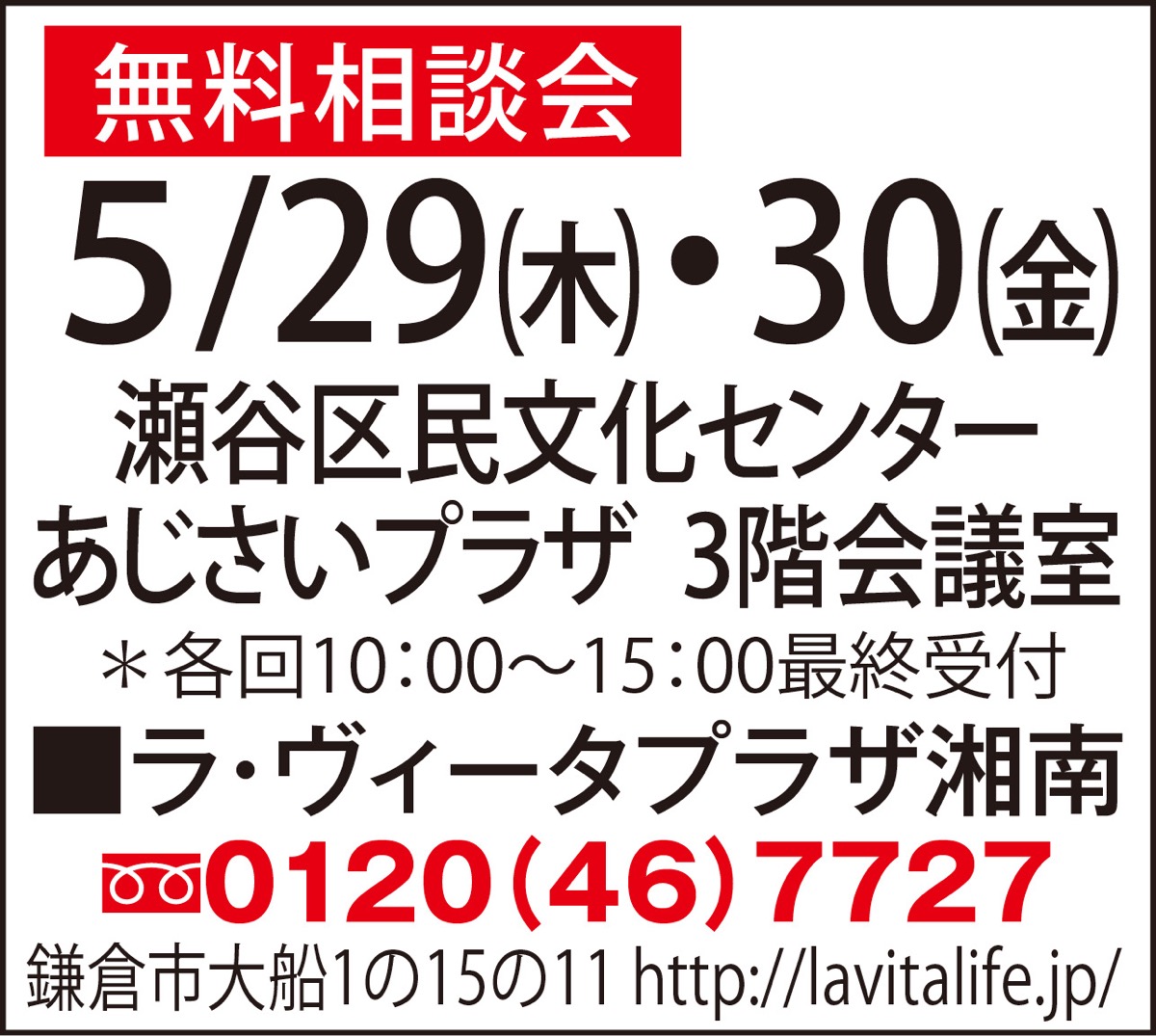 有料老人ホームや高齢者住宅など各種施設を、第三者の立場で紹介する「ラ・ヴィータプラザ湘南」による「無料相談会」が5月29日(木)・30日(金)、瀬谷区民文化センターあじさいプラザ(相鉄本線瀬谷駅直通デッキ徒歩1分)で開催される。予約不要。午前10時から午後3時最終受付。相談は1組1時間程度。