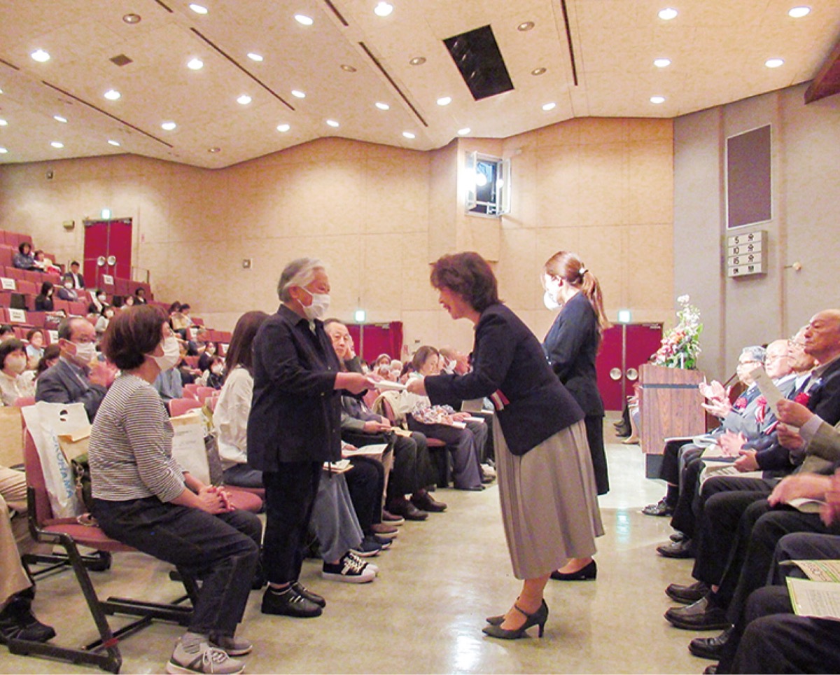 旭区保健活動推進員の委嘱式が4月25日に旭公会堂で開催された。権藤由紀子区長が、各地区の連合会長に委嘱状を手渡した。