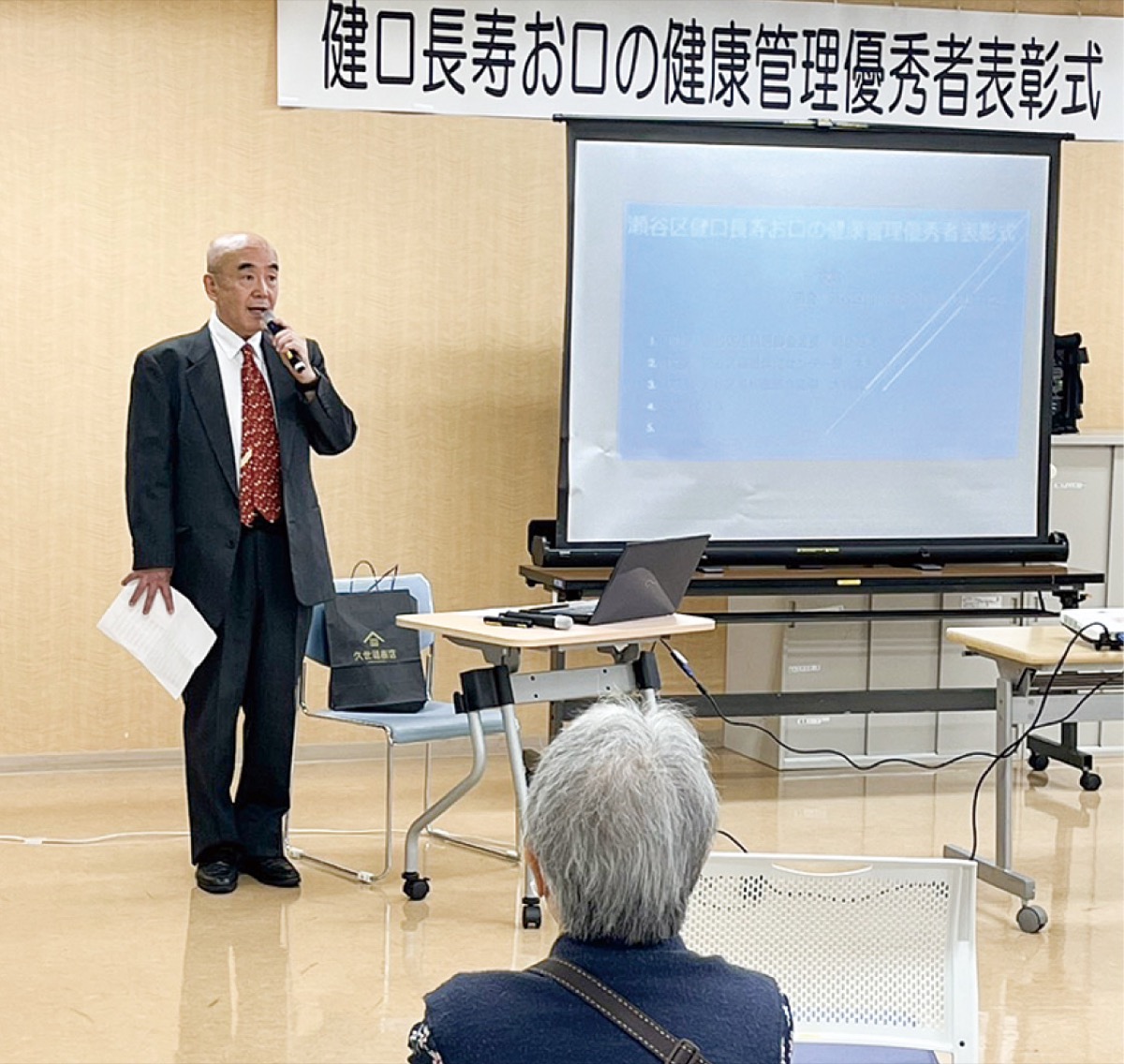 この催しは、6月4日の「むしば歯予防デー」に先駆けて実施されたもの。各歯科医院の推薦を受けた高齢者が「お口の健康管理優秀者」として表彰され、賞状と記念品が贈られた。