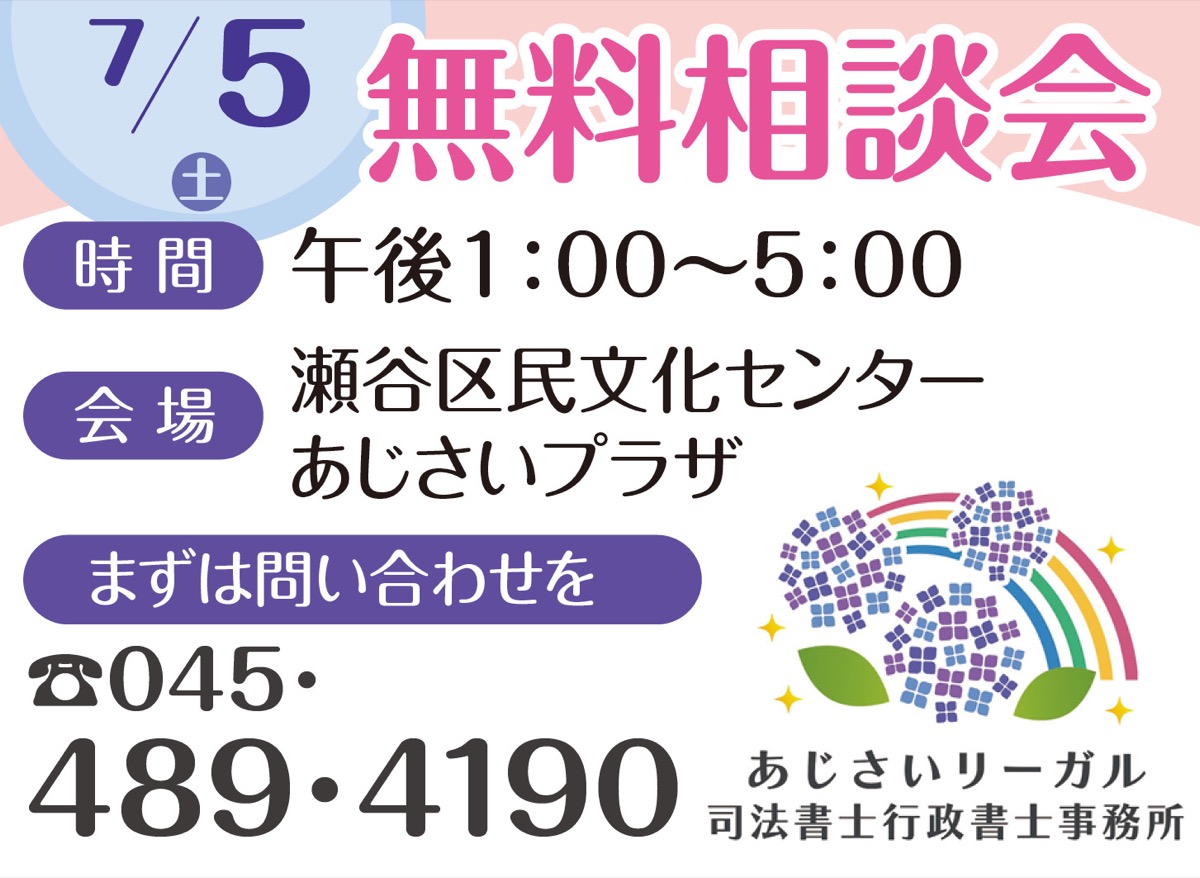 司法書士と税理士が暮らしに身近な法律・税務相談に対応してくれる「あじさい相談会」が7月5日(土)瀬谷区民文化センターあじさいプラザ(瀬谷駅南口直結)の会議室で開かれる。