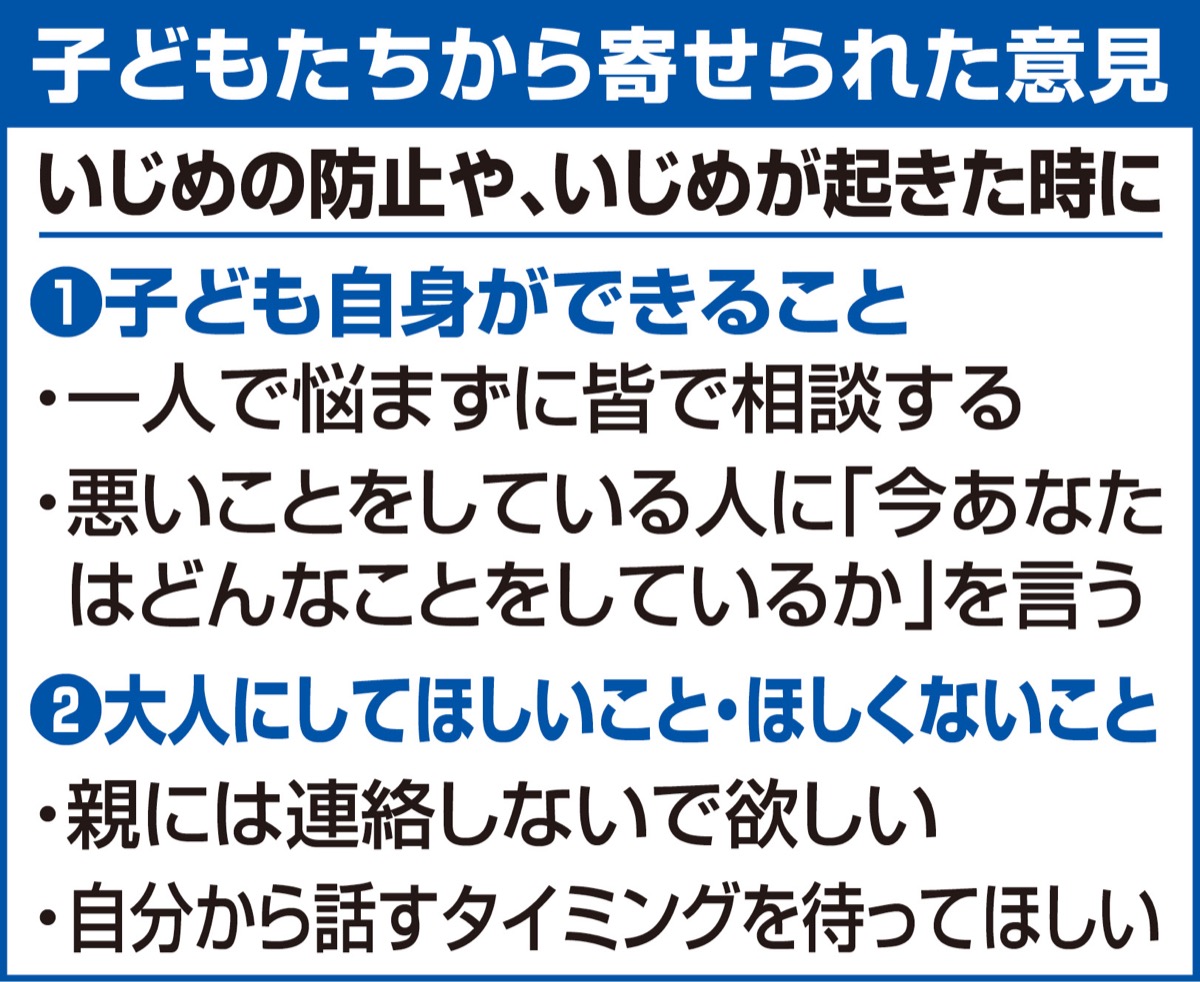 子どもからは、いじめの防止やいじめが起きた際、「子ども自身ができること」として、▼見て見ぬふりをせず皆で向き合う▼相談に乗って、困ったときは助けてあげる▼自分たちで解決する--、また「大人にしてほしいこと・ほしくないこと」として、▼少しでも様子がおかしかったら声をかけてほしい▼誰にも知られないように聞いてほしい▼おおごとにしないでほしい--などの意見が寄せられた。市教委の担当者は、「子どもたちの声が届き、方針の改定に反映された」と成果を強調する。
