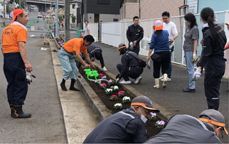 この活動は同自治会が定期的に実施しているもので、当日は町内会館から道路までの道路を清掃。 さらに、同道路の街路灯や大型道路標識などを整備した神奈川区の京浜電設株式会社の社員も駆けつけ、同社が協賛したラベンダー、ペチュニアなどの花苗120株を一緒に花壇へ植え付けた。参加者らは汗を流しながら沿道に彩りを添えていた。