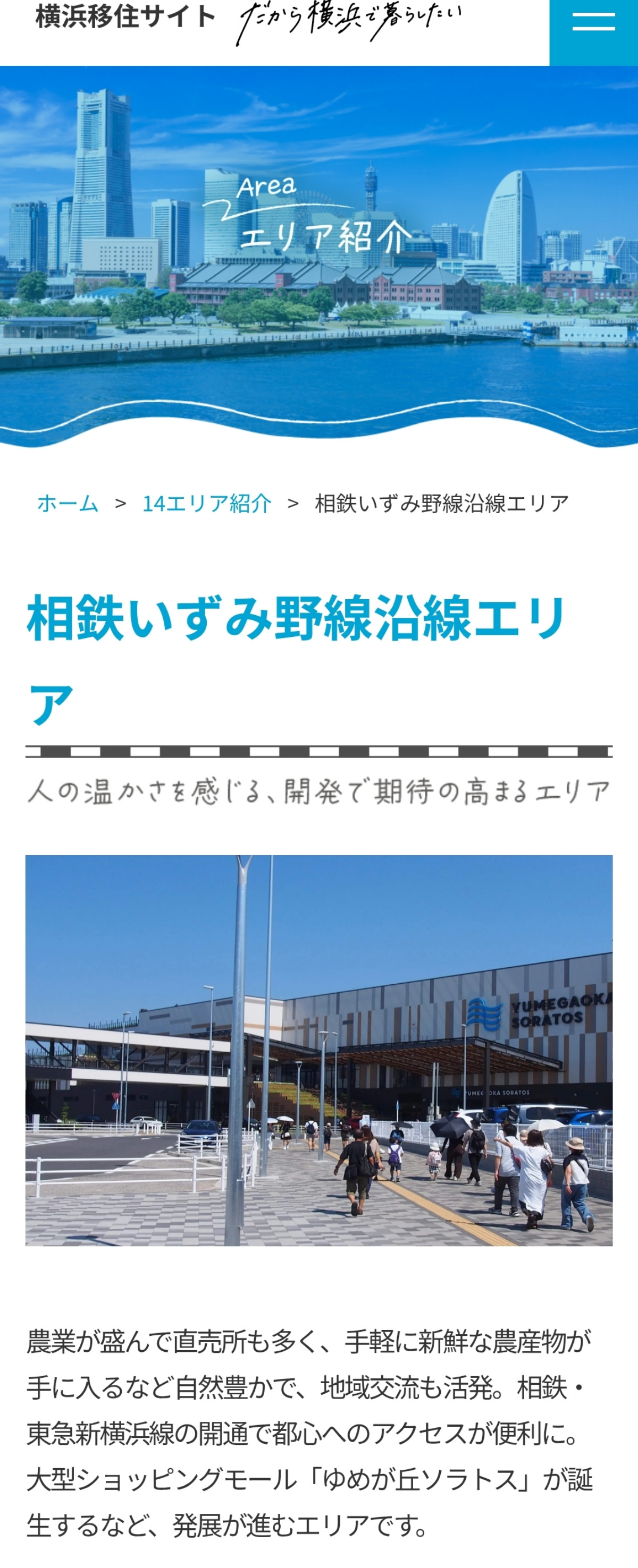 「横浜移住サイト」は横浜での暮らしの魅力を伝える目的で2023年8月に開設され、累計で100万アクセスを超える。市広報・プロモーション戦略課は「横浜というとみなとみらいのイメージが強いが、市内には他にも自然豊かなエリアや下町情緒あふれるエリアなど、多くの魅力があることを知っていただきたい」と話す。「住みたい、住み続けたいまち」としての都市ブランド向上を目指しており、同課は「横浜の新たな魅力を知るきっかけになるので、市民の方にもぜひ『エリア診断』をしてもらえたら」と呼びかける。