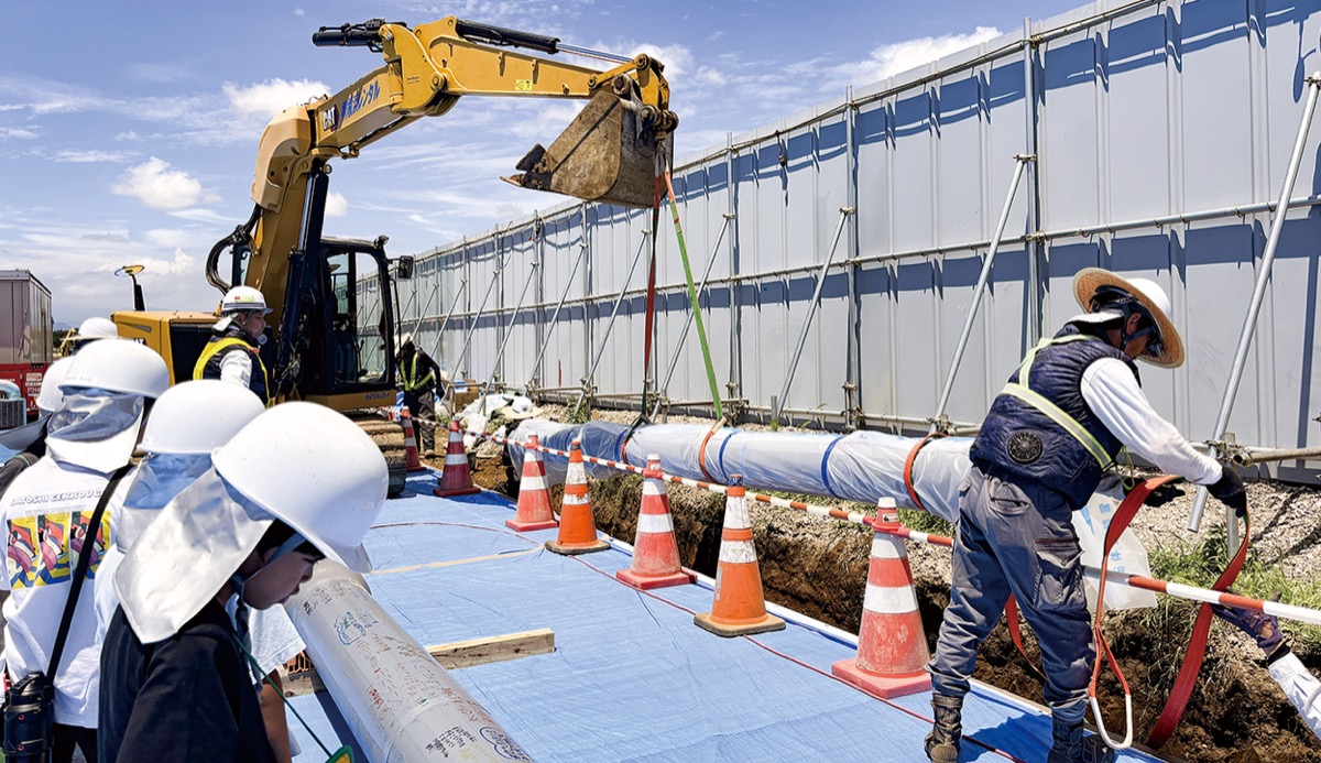 土地区画整理事業が進められている旧上瀬谷通信施設の基盤整備工事の見学会が7月10日、上瀬谷小学校(小林京子校長)の4年生およそ50人を対象に行われた。横浜市水道局北部方面工事課による出張授業で、児童たちは水道管や調整池の工事現場を見学した。