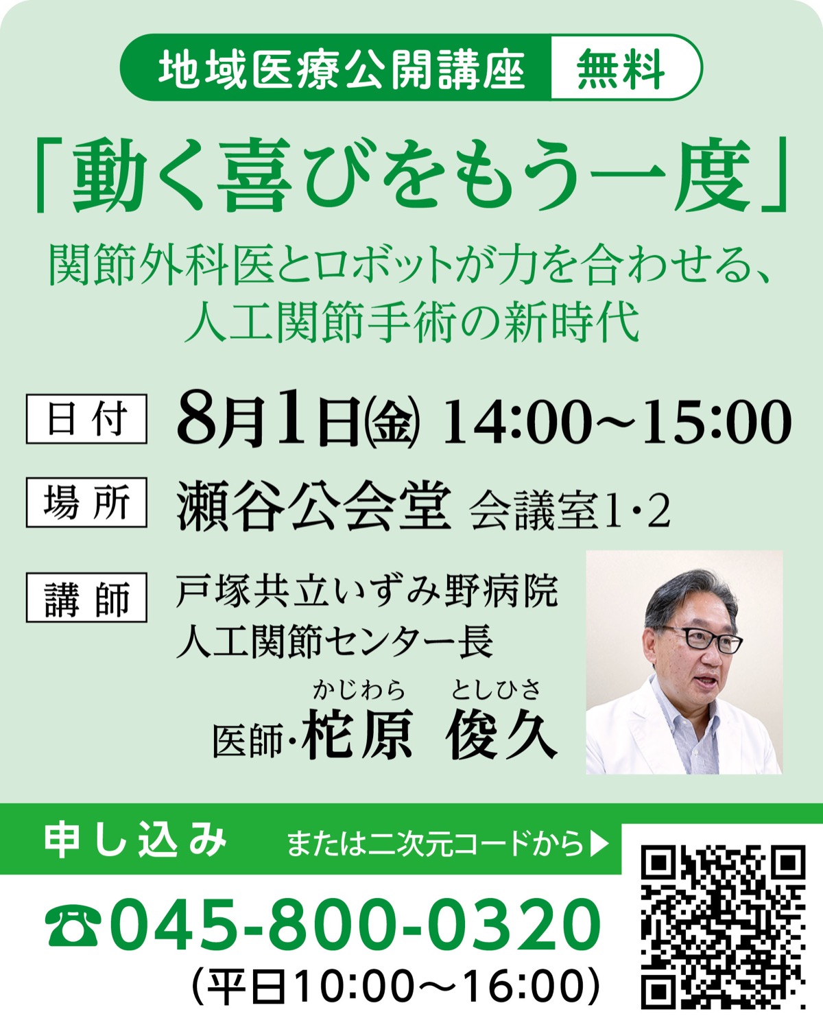 瀬谷公会堂で8月1日(金)、「動く喜びをもう一度 関節外科医とロボットが力を合わせる、人工関節手術の新時代」と題した、地域医療公開講座が開催される。午後2時から3時まで。入場無料。