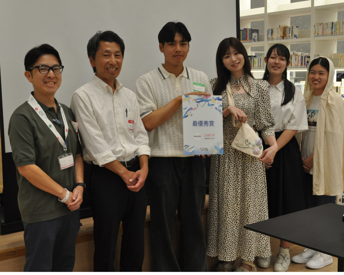 最優秀賞に輝いた「チーム5」のプロダクトは、グリーンエクスポのスタッフ向けに考案したというケープ(ポンチョ)と肩掛けしやすいミニショルダーのほか、休憩所のように涼めるサンシェード。メンバーは「一番長く外にいる人はスタッフです。その暑さ対策は来場者のお手本にもなると考えました」と着眼点を説明する。今後はデザイン性も高めていきたいと言い、「シンプルだけど、見た人に『いいな』と思ってもらえるものを目指したい」と話していた。