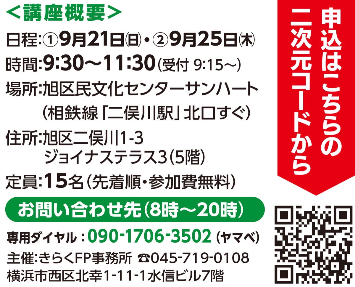 この講座では、「教育資金」「住宅購入」「老後資金」「iDeCo・NISA」など、家計の改善から資産運用まで、幅広いお金の基礎知識について、今人気のファイナンシャルプランナーが、徹底的に解説してくれる。参加は無料、完全予約制。「お金の悩みを解決したい」方は、この機会に参加してみては。