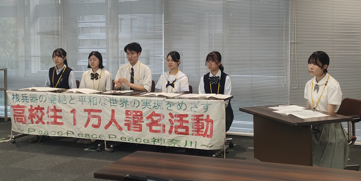 青栁さんや大使選考に応募した生徒は平和活動を行う団体「Peace Peace Peace」のメンバーとして、県内の駅頭で署名活動を行ってきた。8月30日に桜木町駅前で行った活動で青栁さんは「核による平和は成り立たない。高校生が声をあげないといけない状況になっている。今しかタイミングはない」と力強くマイクで訴えた。この日は原田咲希さん=フェリス女学院高校2年=、小野木七海さん=聖セシリア女子高校2年=、浅井柊香さん=自修館中等教育学校5年=も参加し、署名を集めた。