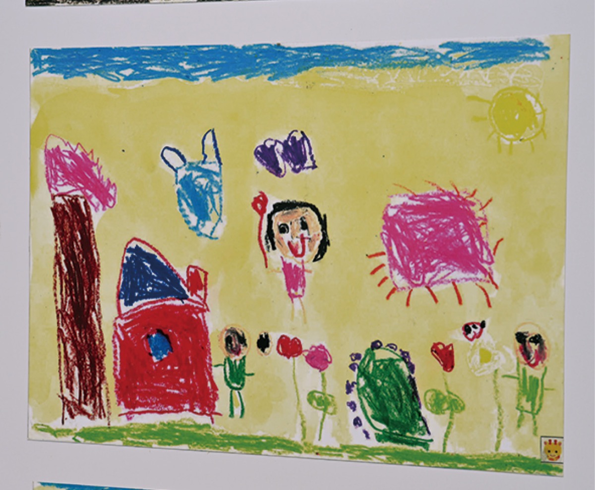 飾られているのは、区内にある公立・私立19園の保育園に通う5歳児250人の描いた絵。GREEN×EXPO 2027のテーマである「幸せを創る明日の風景〜Scenery of the Future for Happiness〜」を踏まえ、自分の好きな花や「こんなお花畑で遊んでみたい」などの内容で制作を進めた。